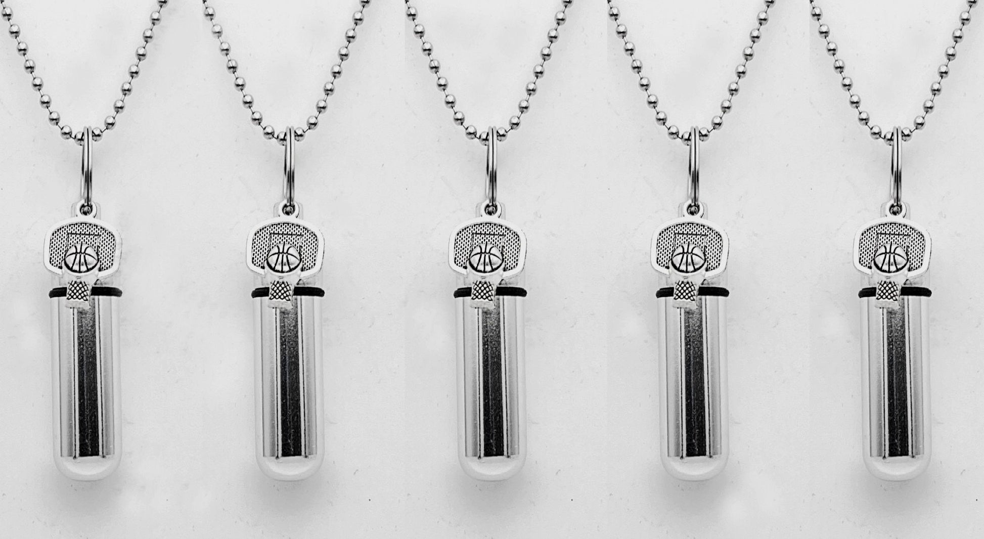 Set of Five Cremation Urn Necklace Keepsakes with Basketball Charm - Memorial Jewelry, Ashes Necklace, Child Urn, Personalized Urn