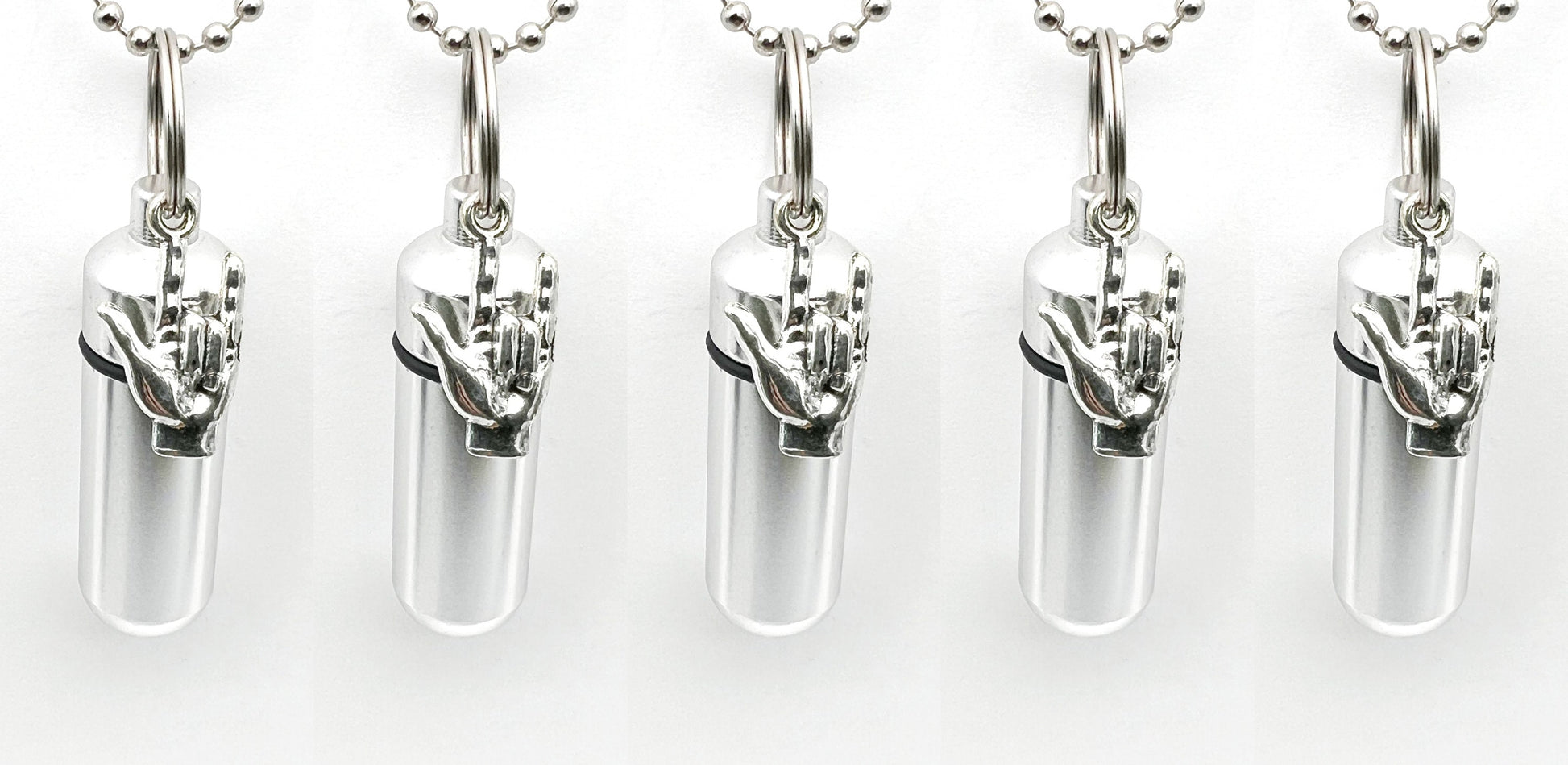 SET OF FIVE: I LOVE YOU (Sign Language) Cremation Urns & containers on FIVE 24" Ball Chain Necklaces. Comes complete with Velvet Pouches and Fill Kit.