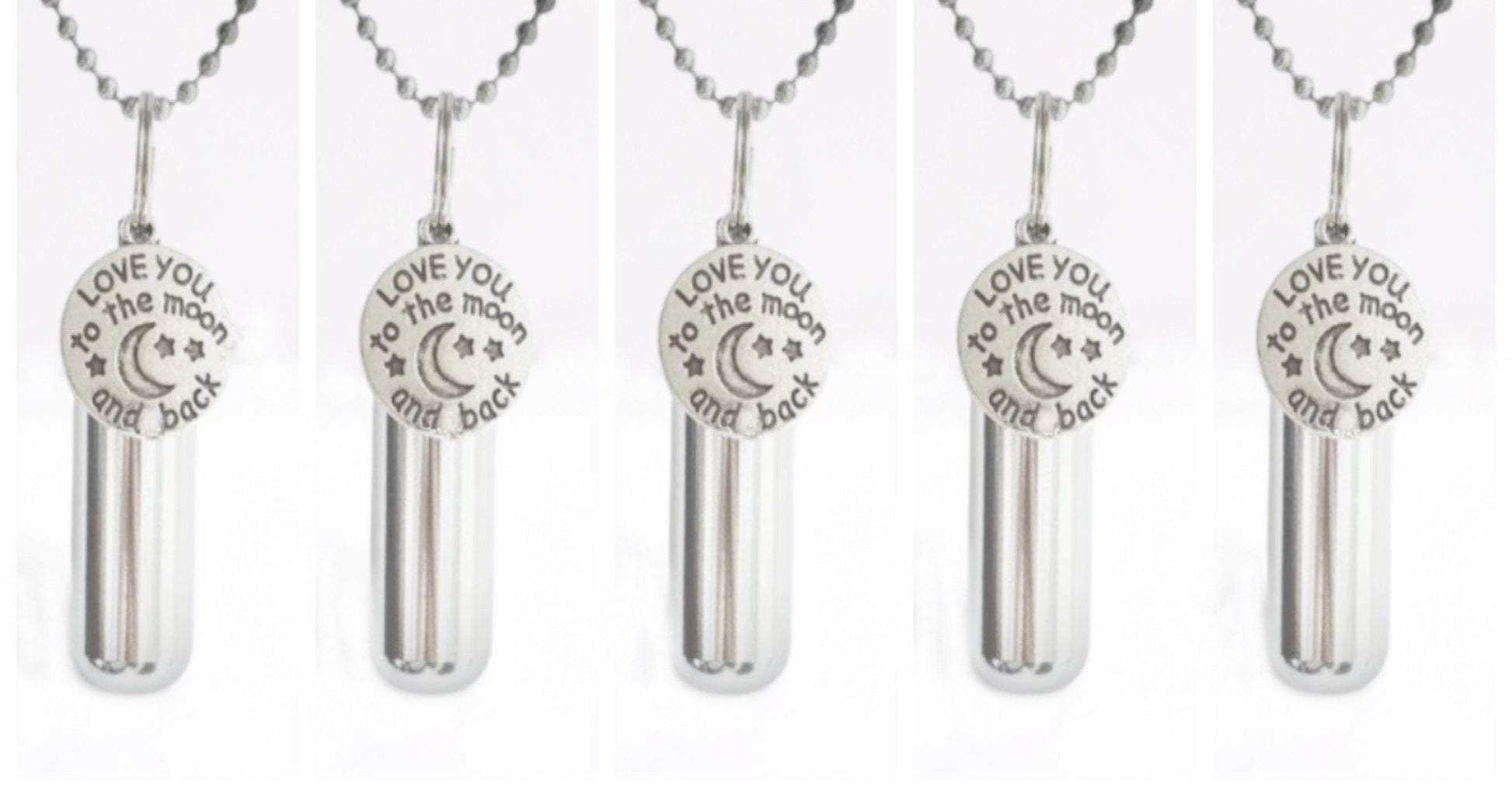 Set of FIVE "I Love You To The Moon And Back" Cremation Urns on 24" Ball Chain Necklaces - Memorial Urn, Ashes Necklace, Pet Urn, Child Urn