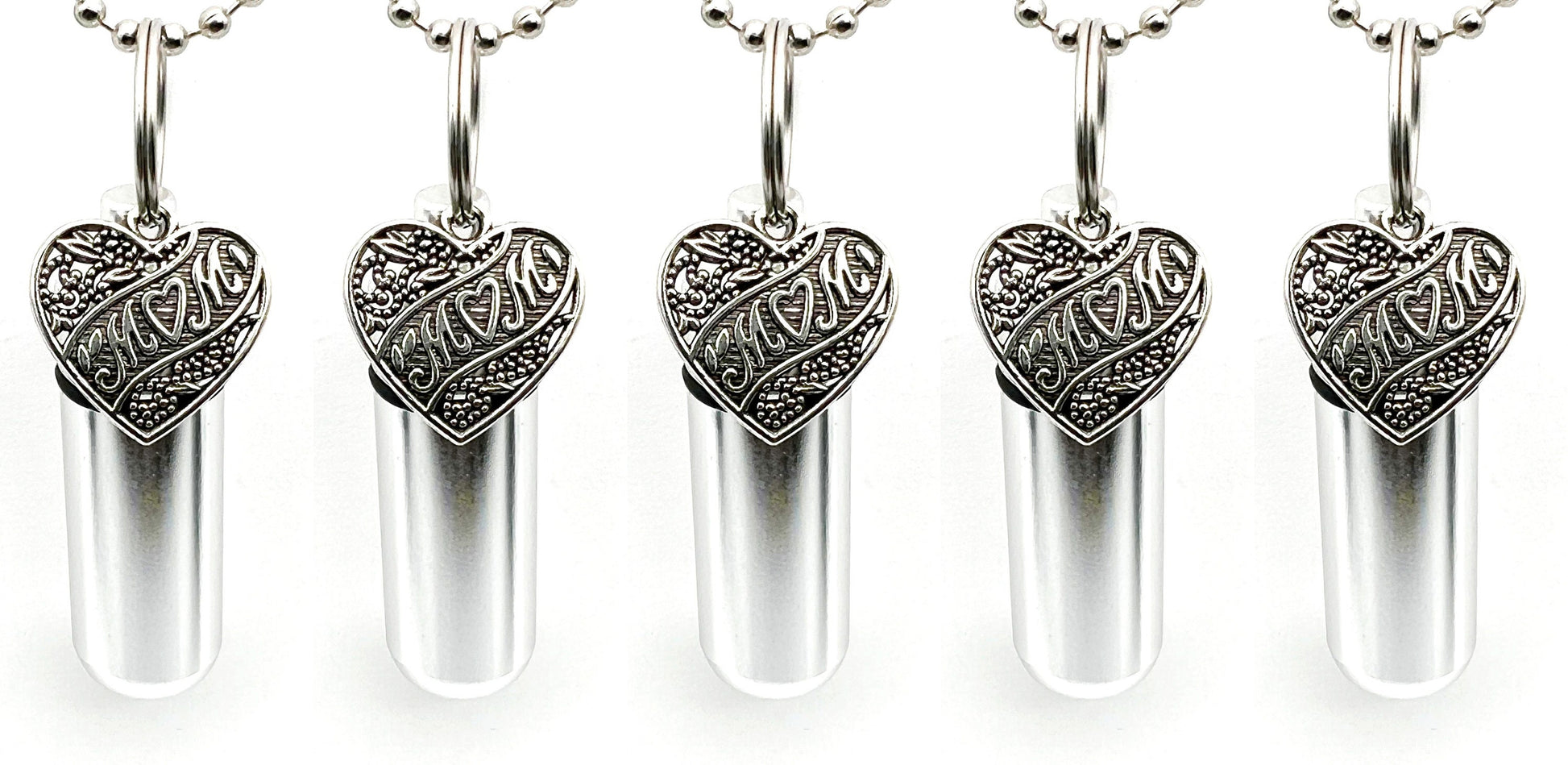 SET OF FIVE: Silver Mom Love Heart Cremation Urns & containers on FIVE 24" Ball Chain Necklaces. Comes complete with Velvet Pouches and Fill Kit.