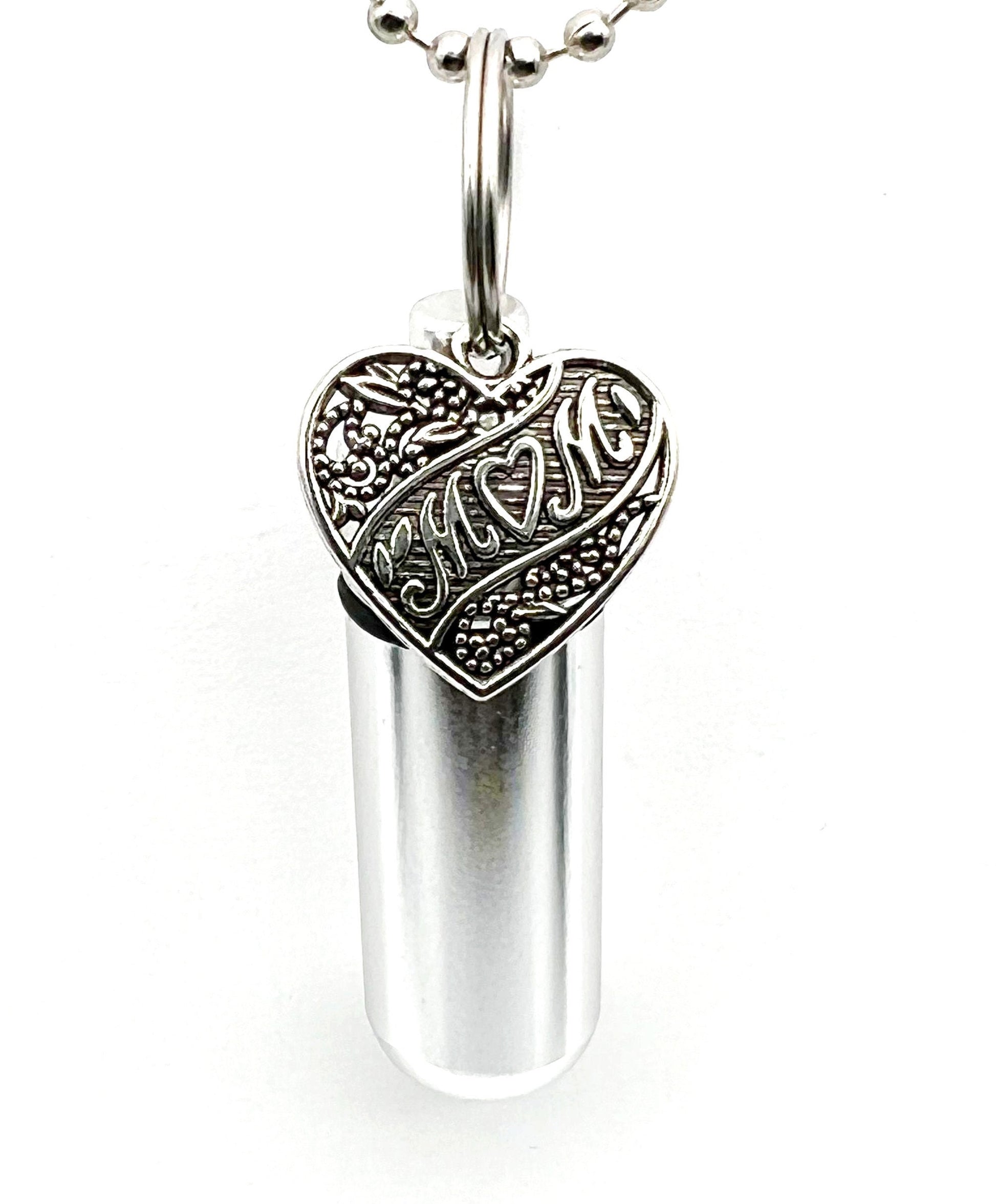 Sturdy, discreet, and secure, this Urn is 1-3/4 inches tall and has a small clear container inside to hold a small amount of your loved ones ashes. Keep them close to you always. Urn is made of aircraft-grade anodized aluminum and will last forever. The urn unscrews to reveal the storage chamber. Inside there is a clear container to keep the ashes safe and dry. A rubber gasket on the screw-on cap provides a waterproof seal. This urn is strong and lightweight enough to carry every day and fits nicely on a keyring or a necklace.