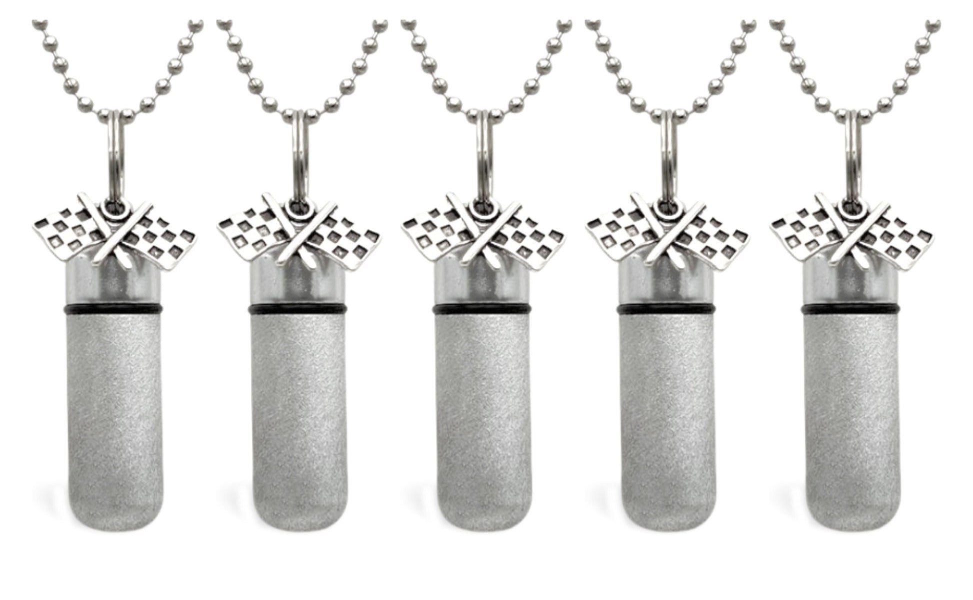 FIVE Brushed Silver Cremation Urns & containers on 24" Ball-Chain Necklaces with Racing Flags