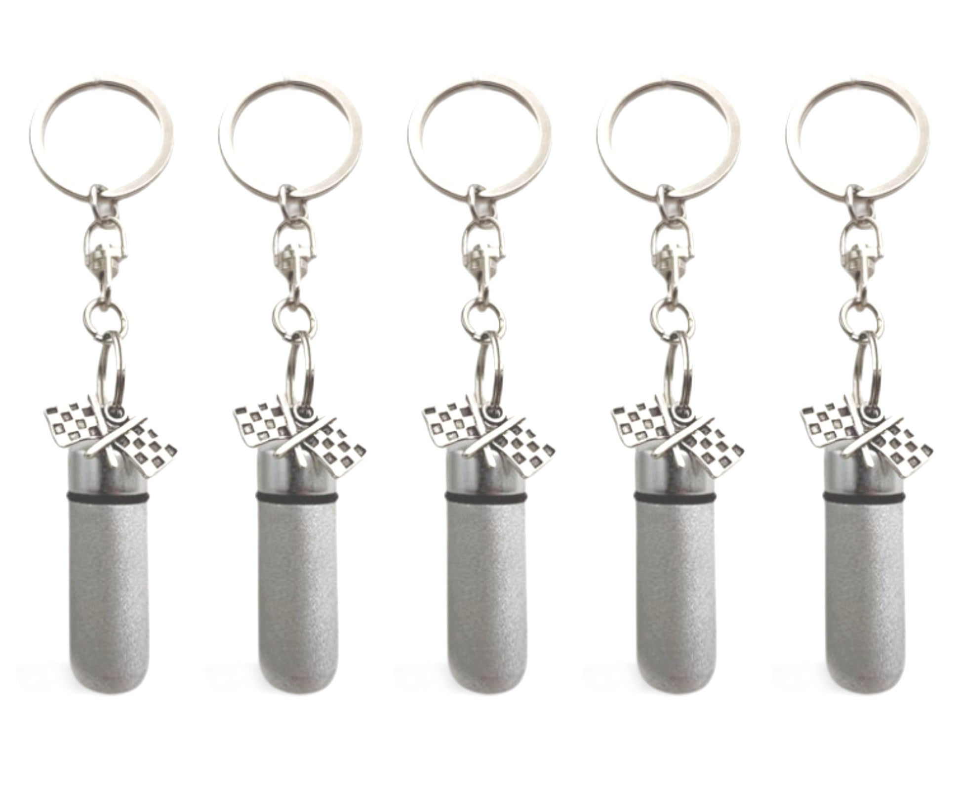 FIVE Brushed Silver Cremation Urns & containers on Stainless Steel Swivel Keychains with Racing Flags