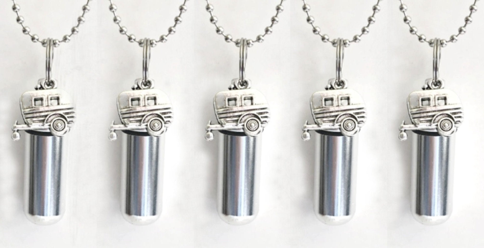 Set Of Five Silver Cremation Urns & containers on 24" Ball Chain Necklaces with RV/Camper/Trailer, comes in Velvet Pouch with fill-kit.