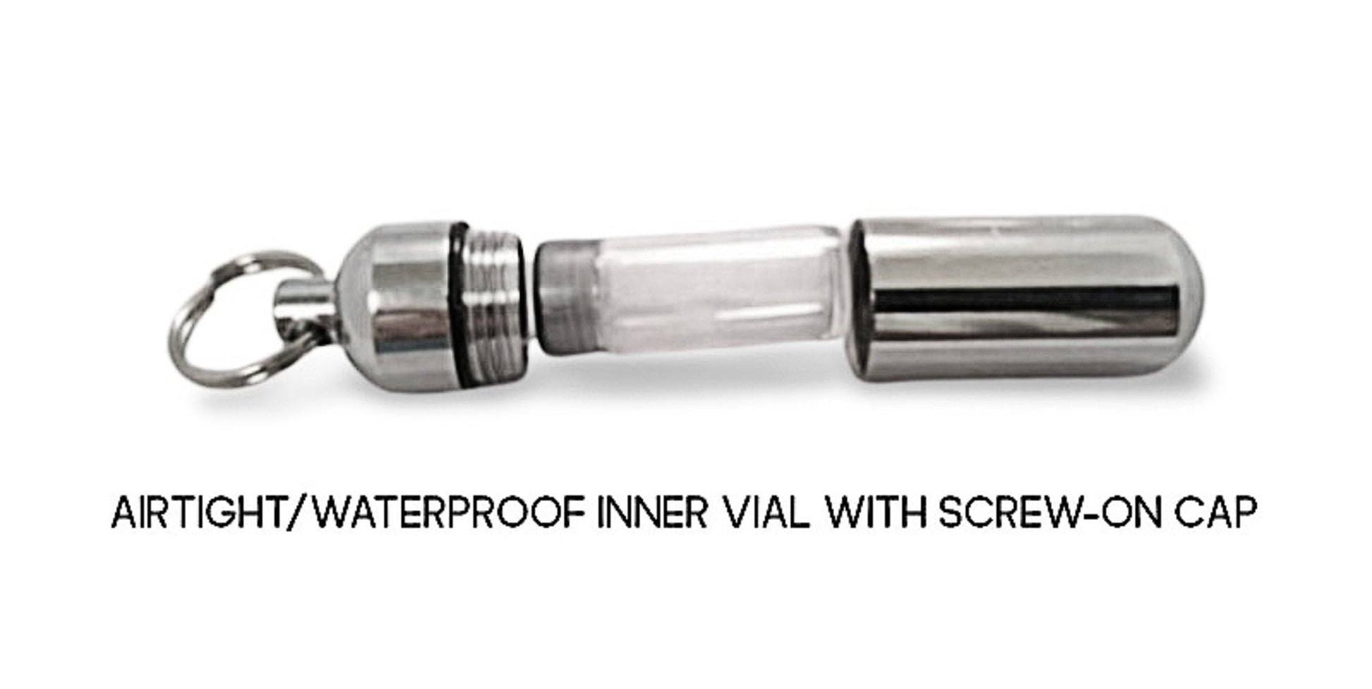 Sturdy, discreet, and secure, this Urn is 1-3/4 inches tall and has a small clear container inside to hold a small amount of your loved ones ashes. Keep them close to you always. It is made of aircraft grade anodized aluminum, and will virtually last forever. The urn unscrews to reveal the storage chamber. Inside there is a clear container to keep the ashes safe and dry. A rubber gasket on the screw-on cap provides a waterproof seal. These urns are strong and lightweight enough to carry every day and fits nicely on a key ring or a necklace.
