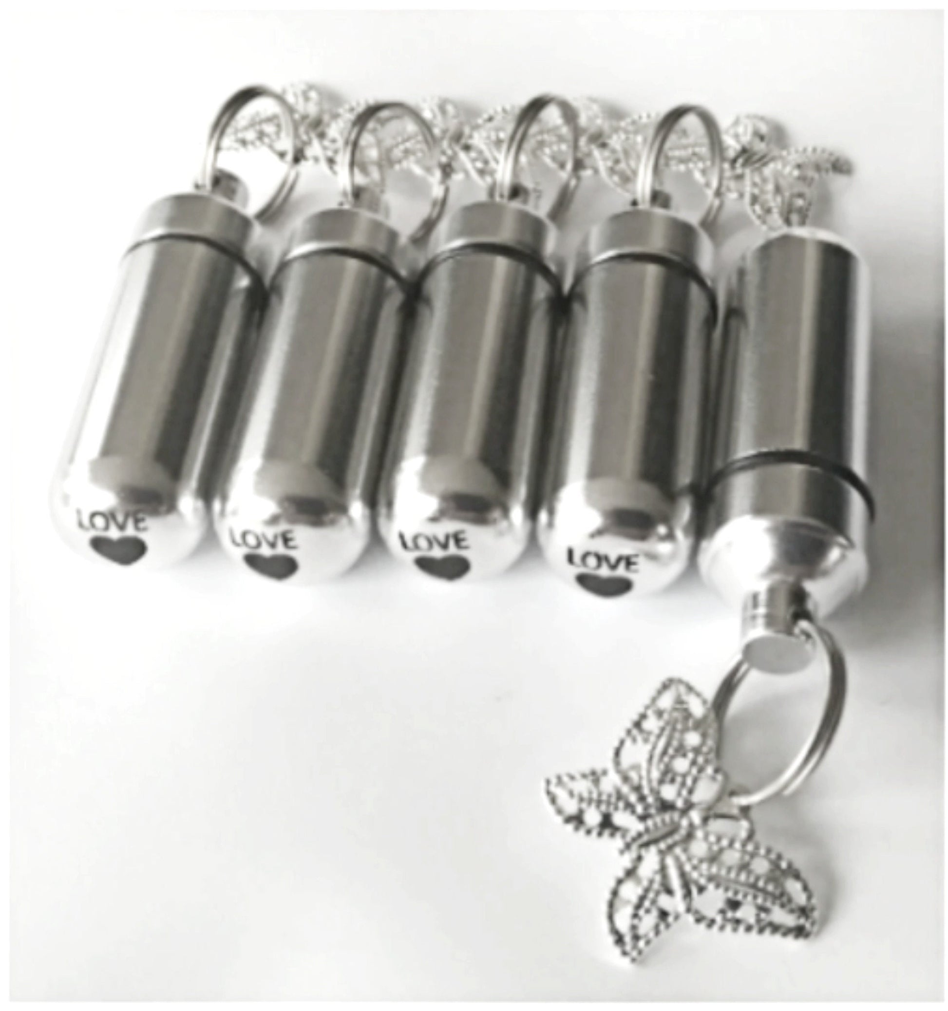 Sturdy, discreet, and secure, this Urn is 1-3/4 inches tall and has a small clear container inside to hold a small amount of your loved ones ashes. Keep them close to you always. Urn is made of aircraft-grade anodized aluminum and will last forever. The urn unscrews to reveal the storage chamber. Inside there is a clear container to keep the ashes safe and dry. A rubber gasket on the screw-on cap provides a waterproof seal. These urns are strong and lightweight enough to carry every day and fits nicely on a keyring or a necklace.