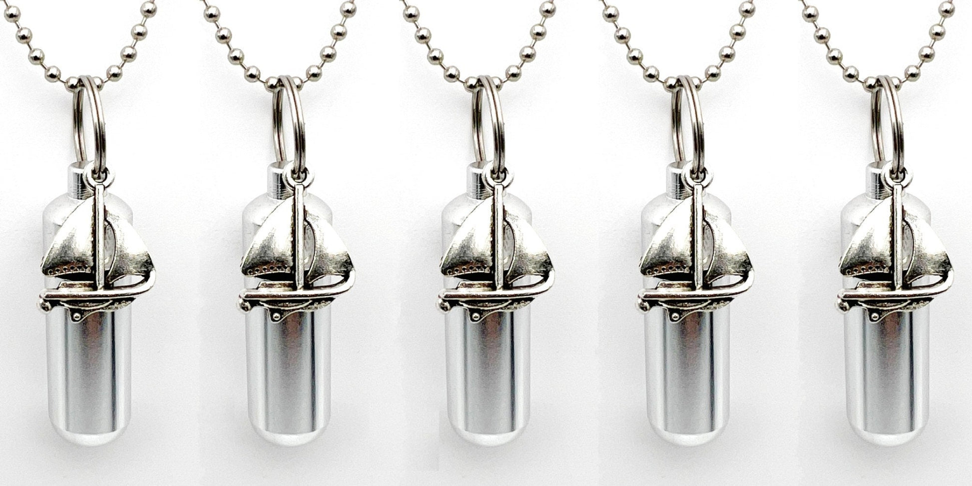 SET OF FIVE: Silver Sail Boat Cremation Urn & container on FIVE 24" Steel Ball Chain Necklaces. Comes complete with Velvet Pouches and Fill Kit.