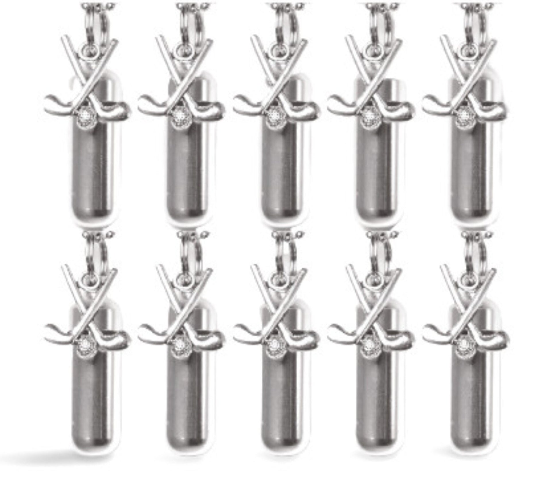 YOU GET TEN GOLF CLUB CREMATION URN NECKLACE KEEPSAKES, TEN VELVET POUCHES, A FILL KIT, AND TEN STEEL 24" BALL CHAINS.