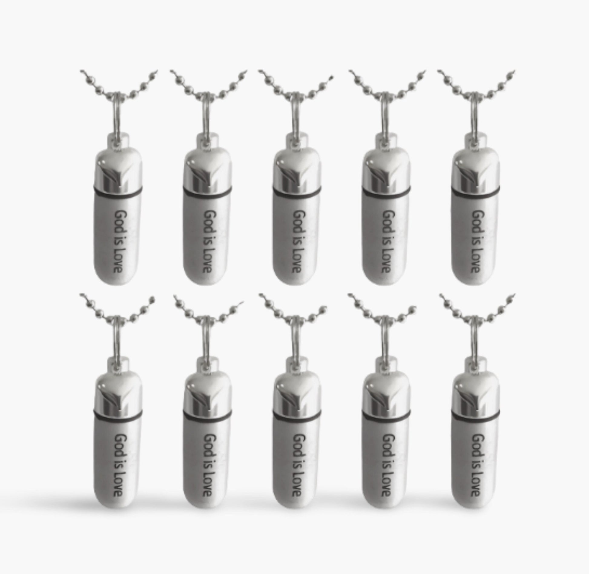 Set of TEN Brushed Silver "God is Love" Anointing Oil Holders with Hearts - With 10 Pouches, 10 Ball Chain Necklaces, & 10 fill kits