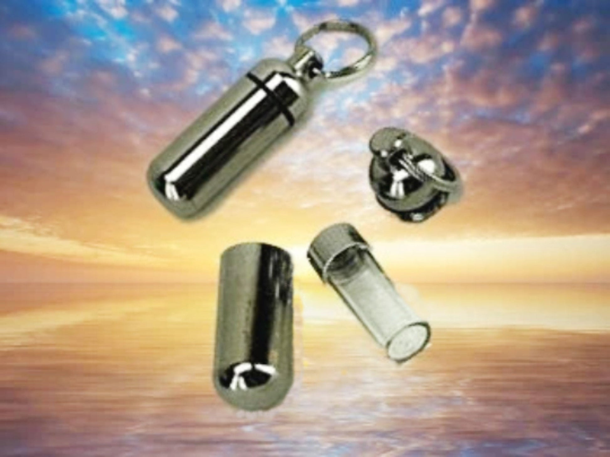 Sturdy, discreet, and secure, this Urn is 1-3/4 inches tall and has a small clear container inside to hold a small amount of your loved ones ashes. Keep them close to you always. It is made of aircraft grade anodized aluminum, and will virtually last forever. The urn unscrews to reveal the storage chamber. Inside there is a clear container to keep the ashes safe and dry. A rubber gasket on the screw-on cap provides a waterproof seal. These urns are strong and lightweight enough to carry every day and fits nicely on a keyring or a necklace.