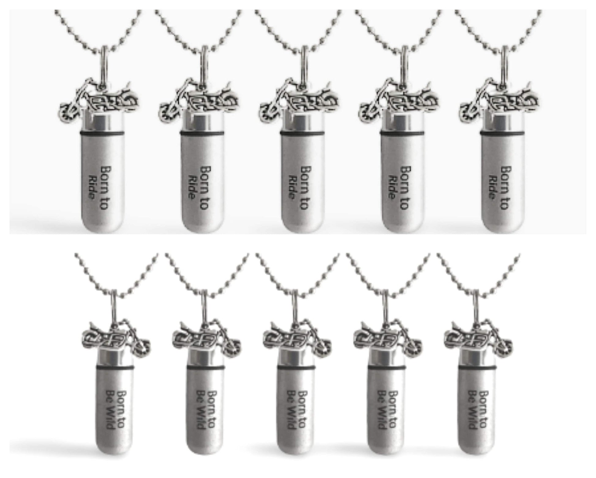 Set of TEN ENGRAVED Brushed Silver Cremation Urn Necklaces with Motorcycles - (5) "Born To Be Wild" & (5) "Born To Ride" - Memorial Jewelry