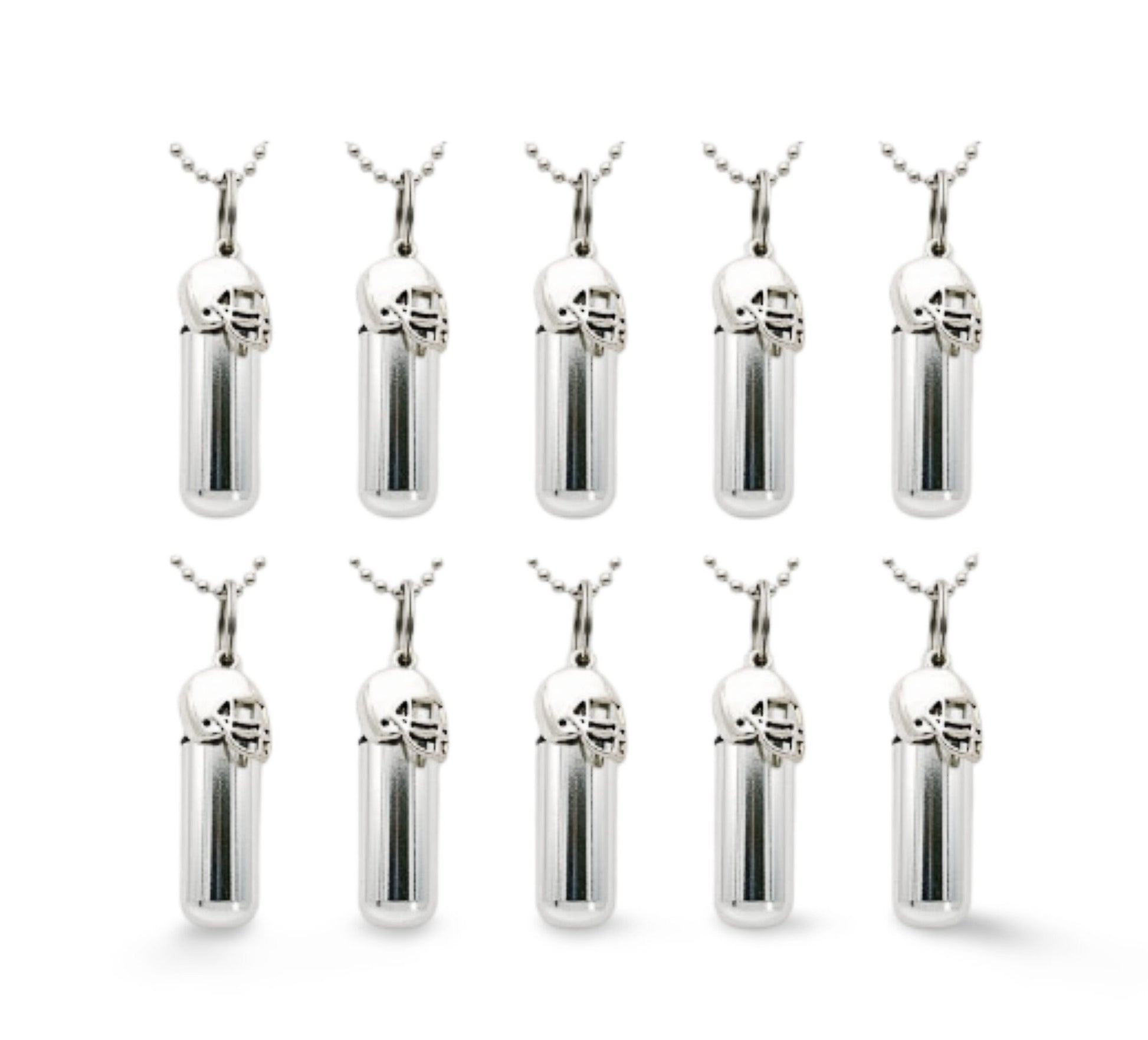 SET OF TEN Silver Cremation Urns & containers on 24" Steel Ball Chain Necklaces with FOOTBALL HELMETS