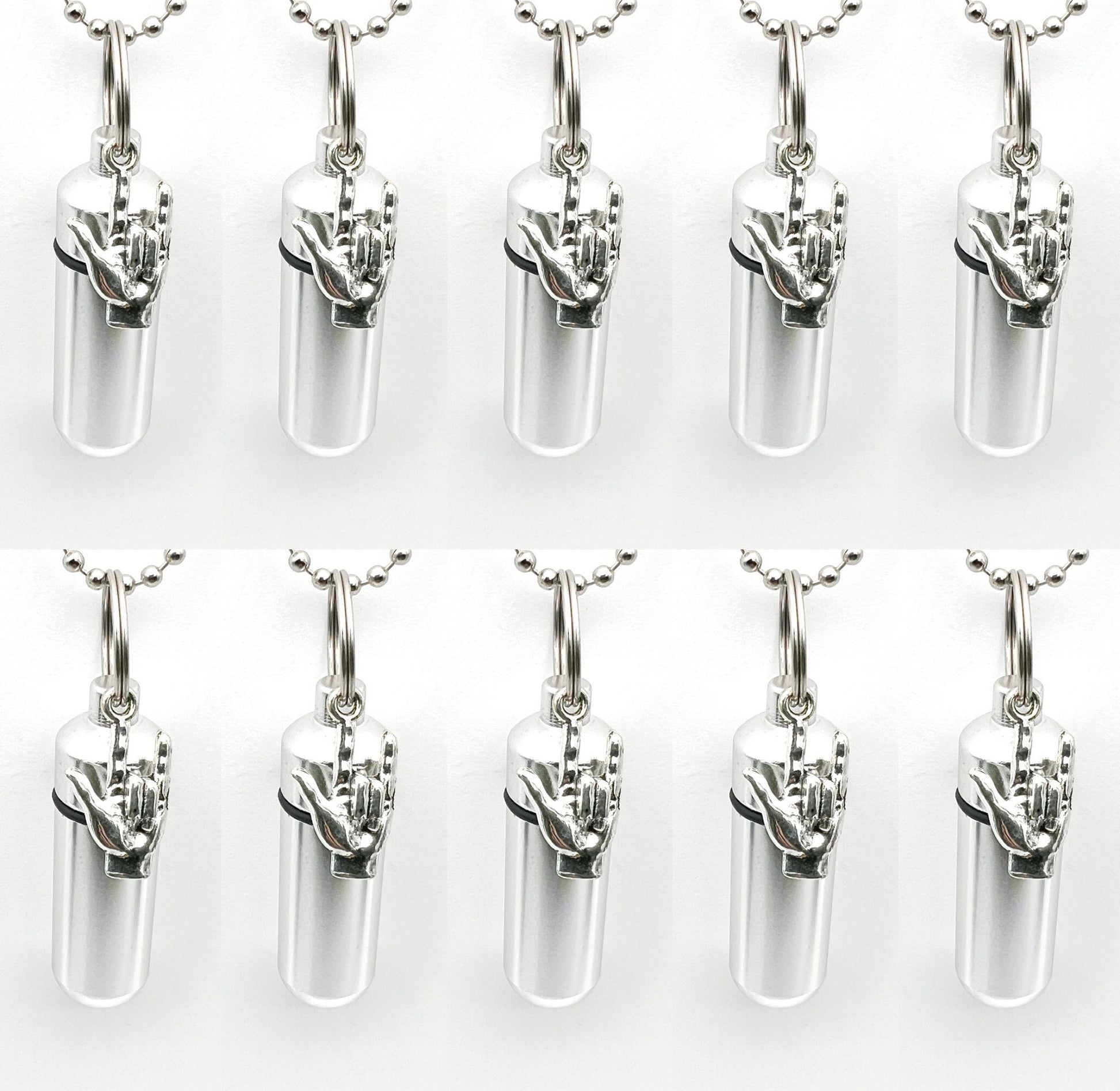 SET OF TEN: I LOVE YOU (Sign Language) Cremation Urns & containers on TEN 24" Ball Chain Necklaces. Comes complete with Velvet Pouches and Fill Kit.