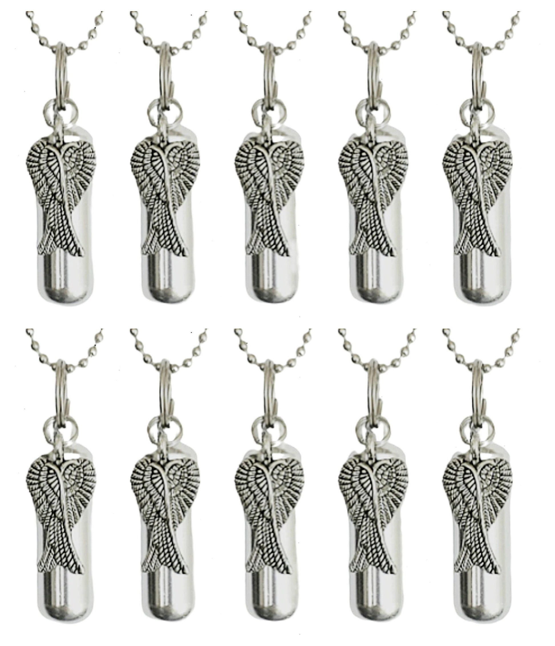 Set of TEN Silver Cremation Urn Necklaces with Angel Wings - Memorial Jewelry, Mourning Keepsake, Child Urn, Pet Urn, Personalized Urn