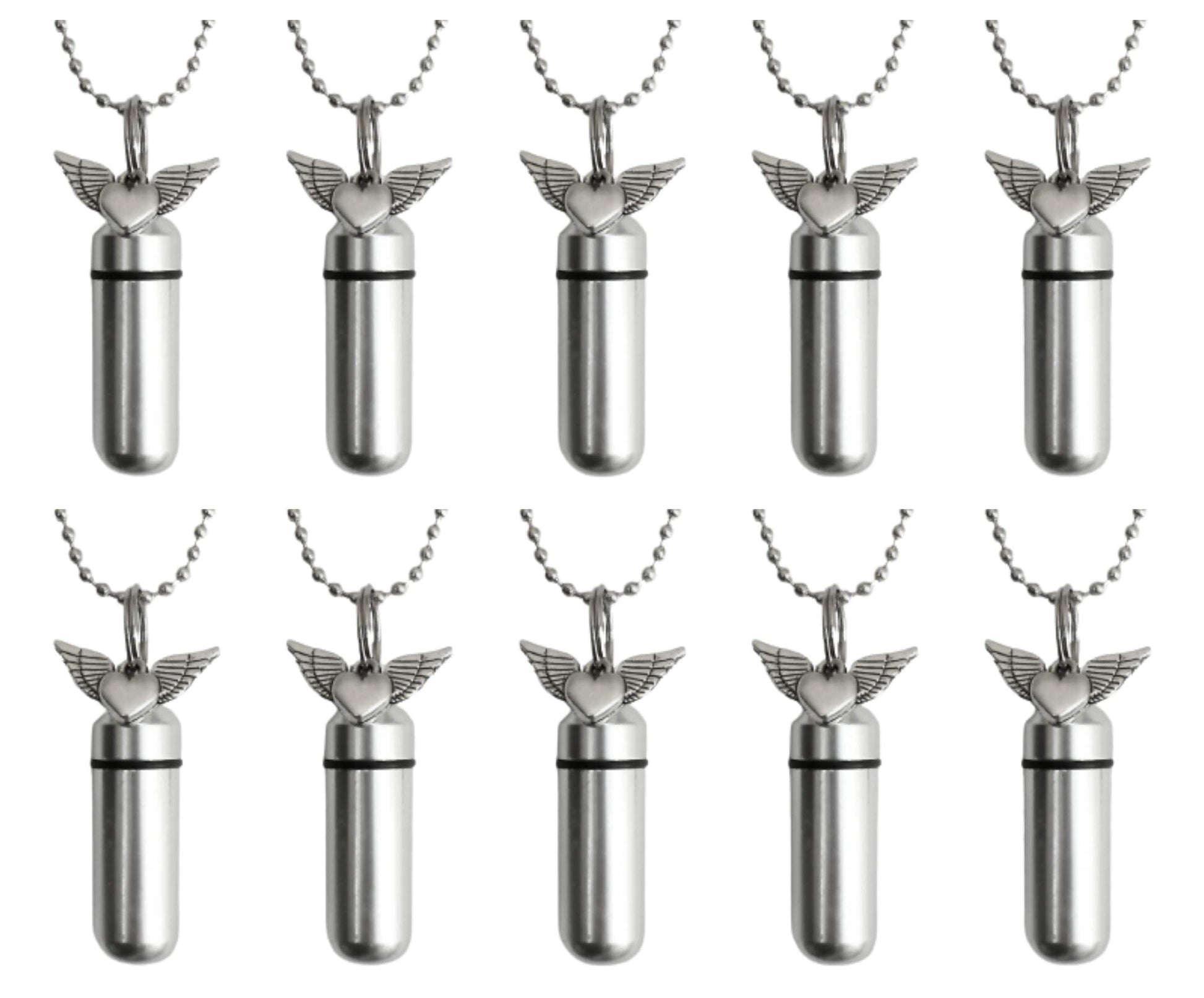 Set of TEN Silver CREMATION URN Necklaces with Winged Hearts - Memorial Jewelry, Urn Pendant, Urn For Human Ashes, Pet Ashes, Personalized