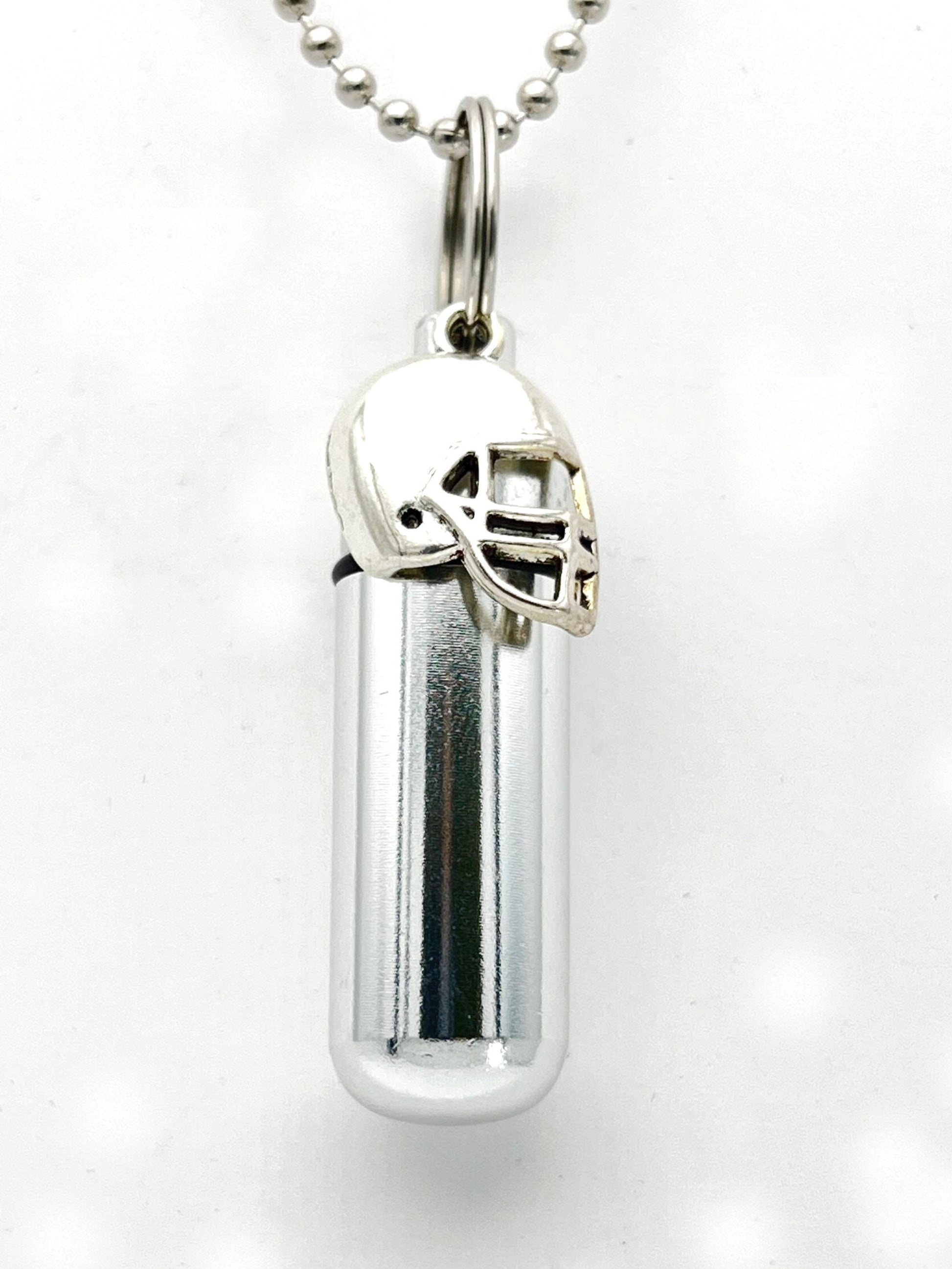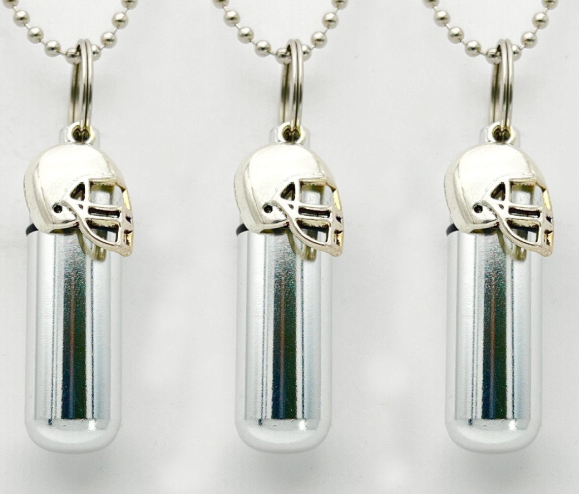 SET OF THREE Silver Cremation Urns & containers on 24" Steel Ball Chain Necklaces with Football Helmets