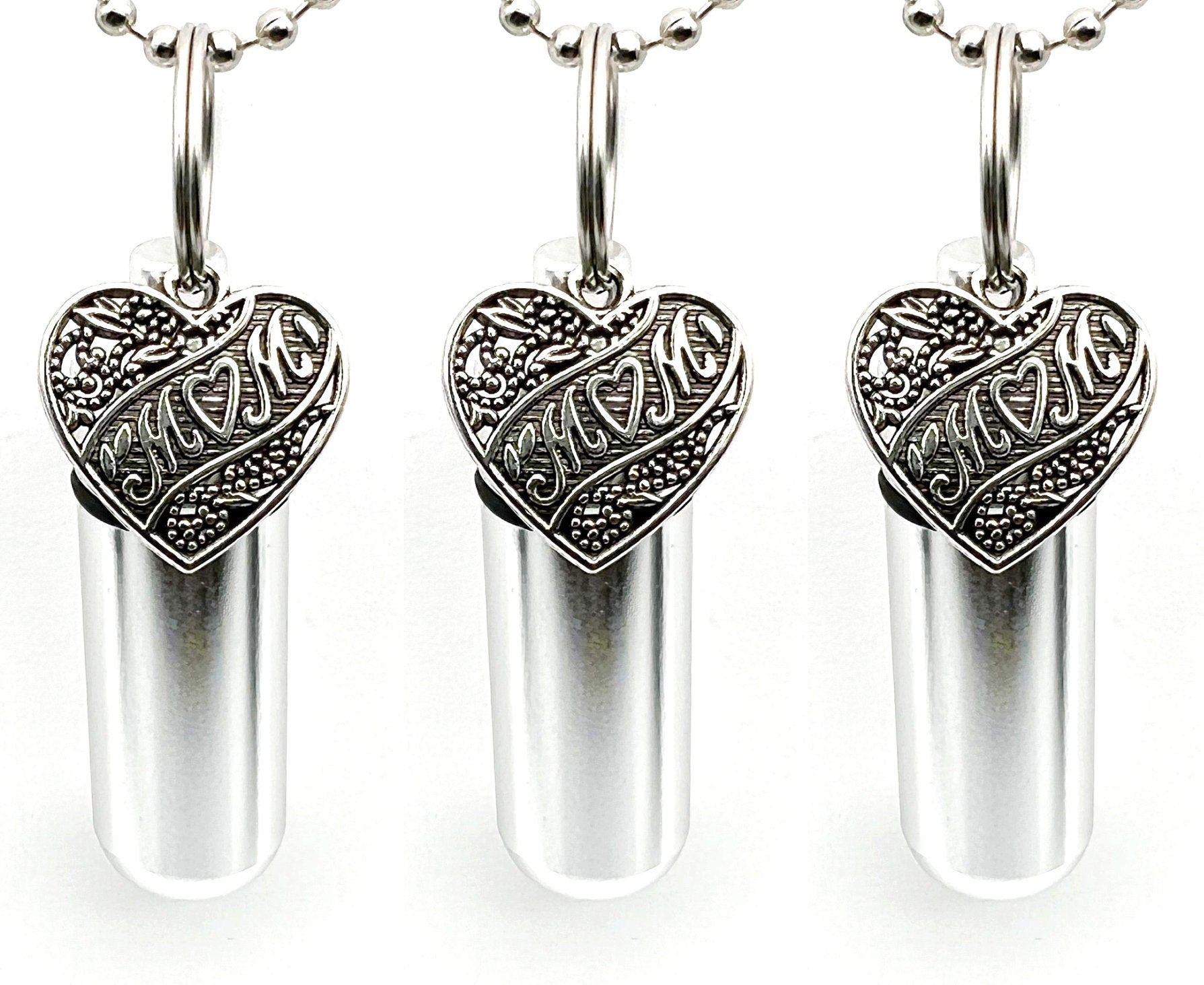 SET OF THREE: Silver Mom Love Heart Cremation Urns & containers on THREE 24" Ball Chain Necklaces. Comes complete with THREE Velvet Pouches and Fill Kit.