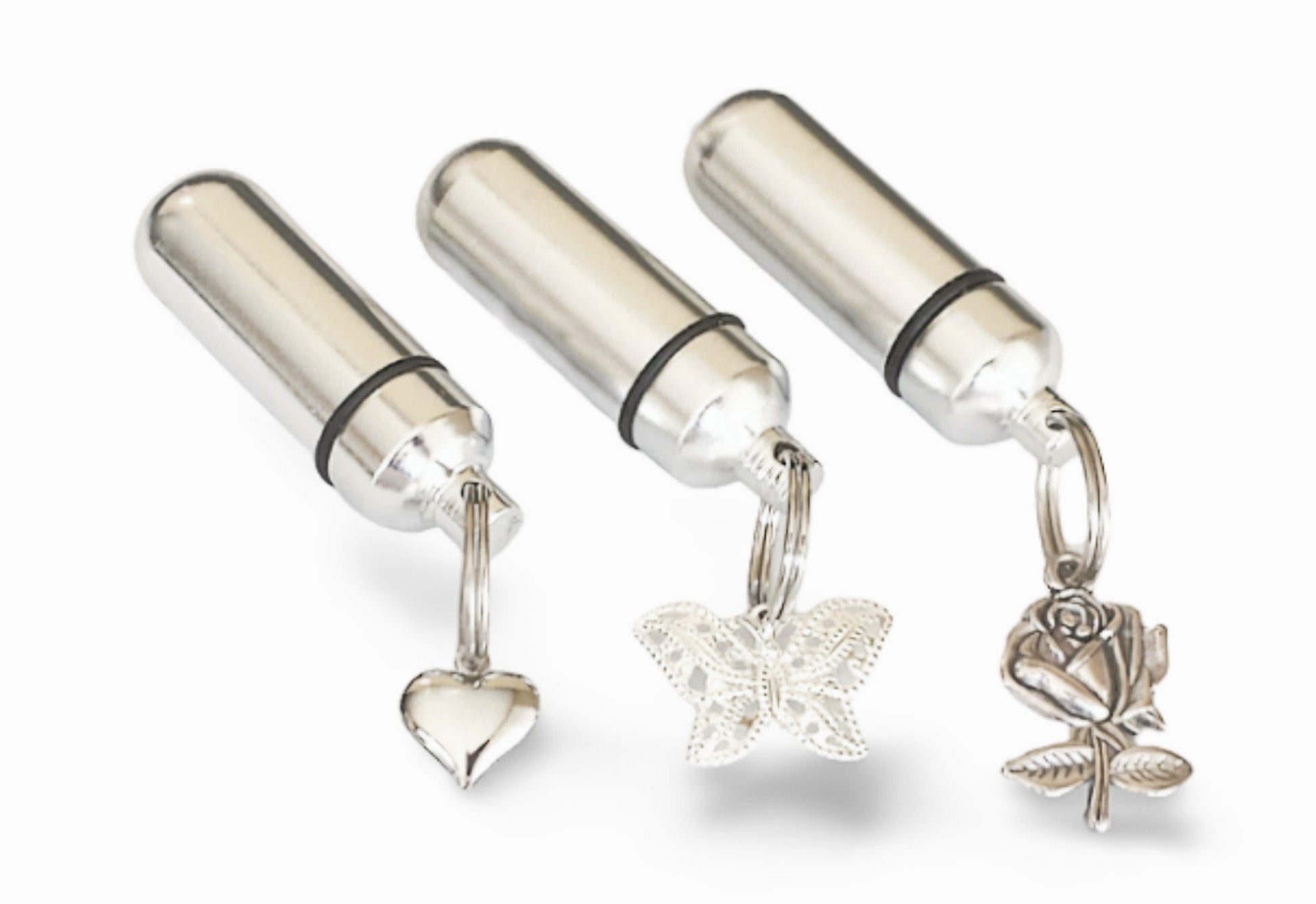 Sturdy, discreet, and secure, this Urn is 1-3/4 inches tall and has a small clear container inside to hold a small amount of your loved ones ashes. Keep them close to you always. Urn is made of aircraft-grade anodized aluminum and will last forever. The urn unscrews to reveal the storage chamber. Inside there is a clear container to keep the ashes safe and dry. A rubber gasket on the screw-on cap provides a waterproof seal. These urns are strong and lightweight enough to carry every day and fits nicely on a keyring or a necklace.