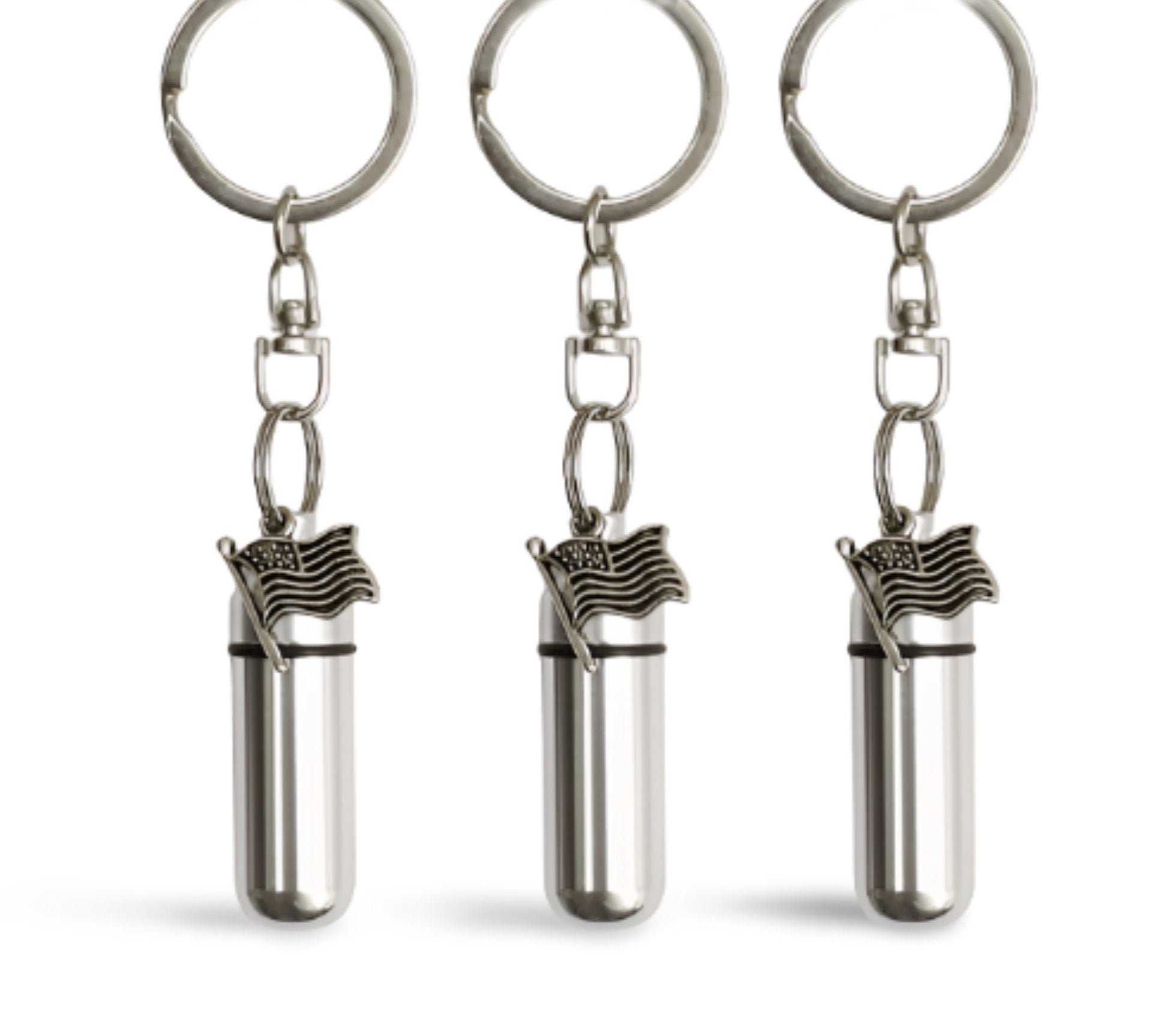 Set of THREE Silver American Flag Cremation Urn Keepsakes on Swivel Steel Keychains, Ashes urn, Memorial Keepsake, Mourning Jewelry, Pet Urn