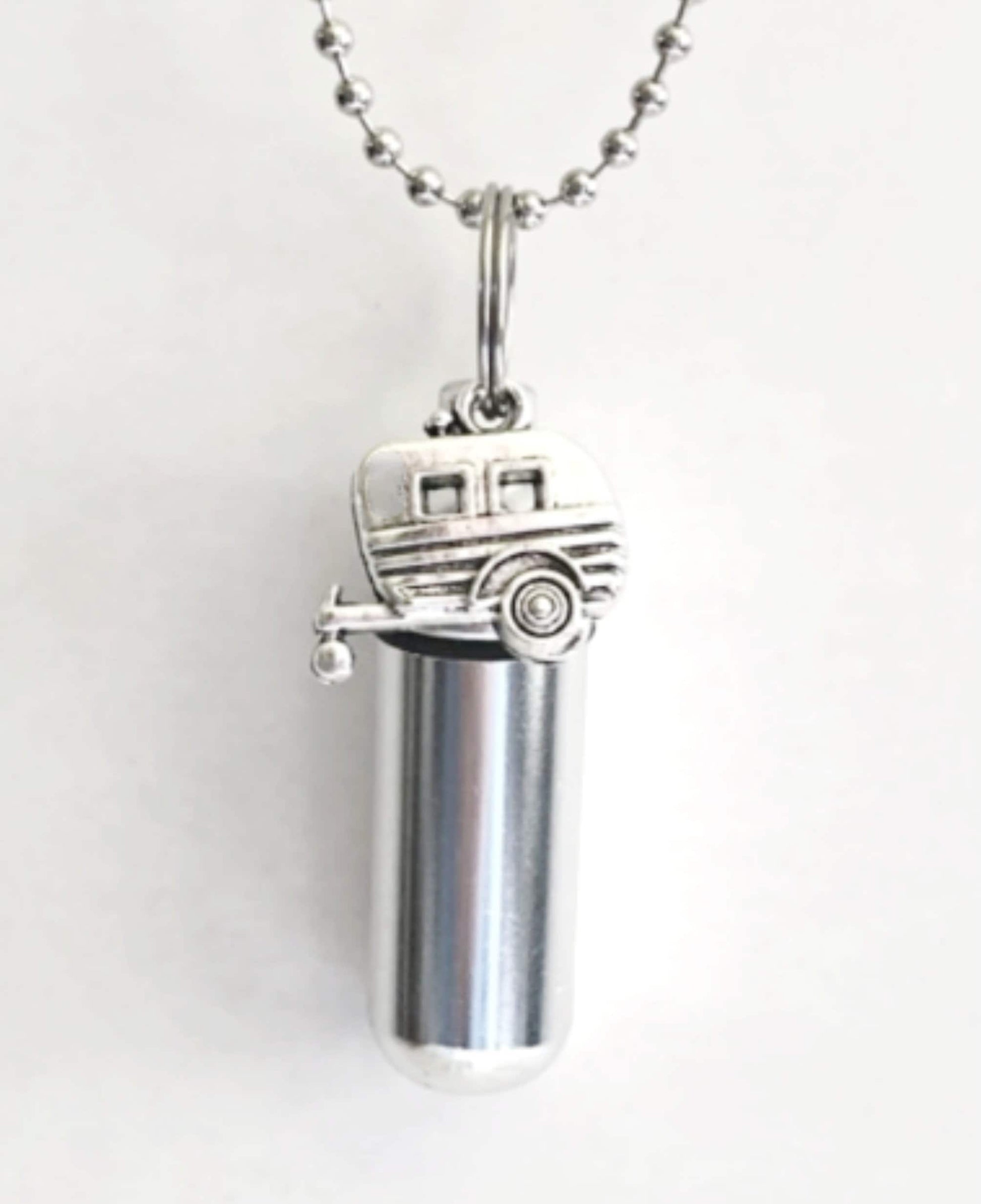Silver Cremation Urn & container on 24" Silver Necklace with RV/Camper/Trailer Comes in Velvet Pouch with fill-kit.