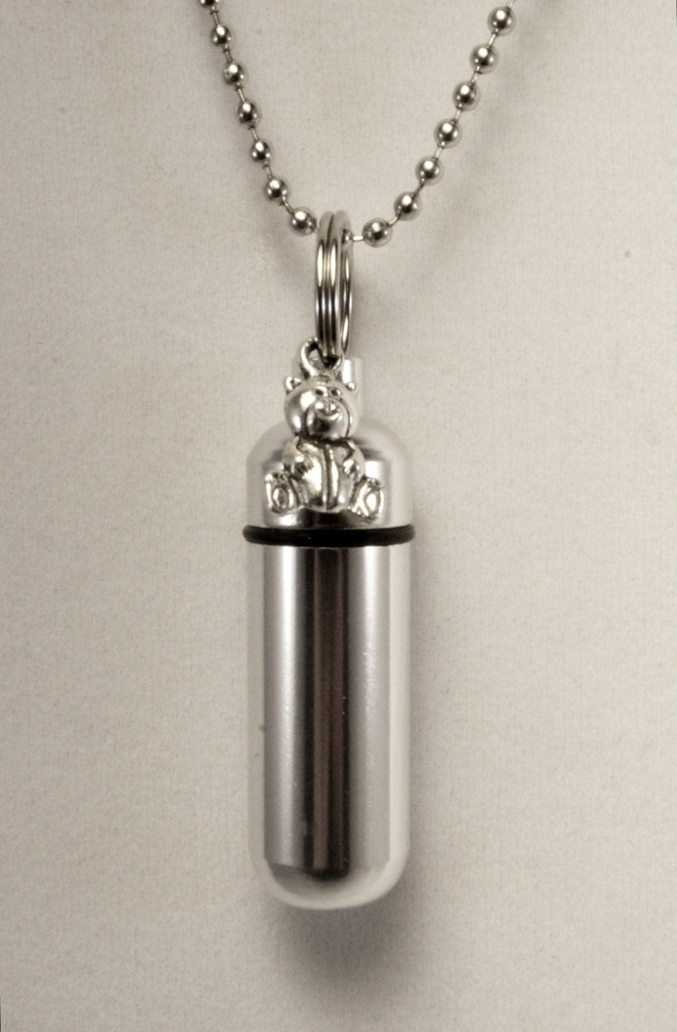 Sturdy, discreet, and secure, this Urn is 1-3/4 inches tall and has a small clear container inside to hold a small amount of your loved ones ashes. Keep them close to you always. Urn is made of aircraft-grade anodized aluminum and will last forever. The urn unscrews to reveal the storage chamber. Inside there is a clear container to keep the ashes safe and dry. A rubber gasket on the screw-on cap provides a waterproof seal. These urns are strong and lightweight enough to carry every day and fits nicely on a keyring or a necklace.