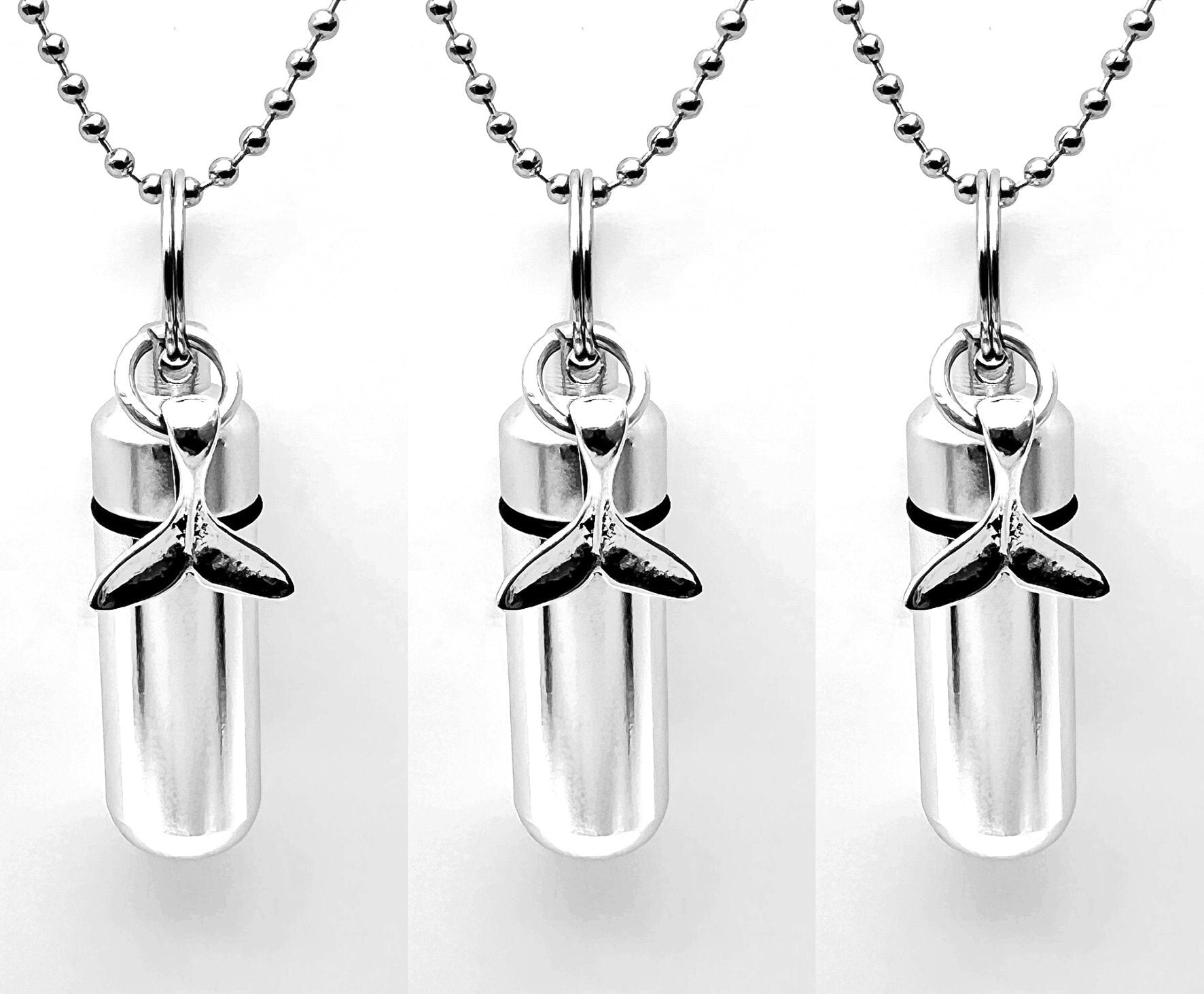 SET OF THREE: Silver Cremation Urn & container on 24" Necklace with Whale Tail comes complete with Velvet Pouch and Fill Kit.