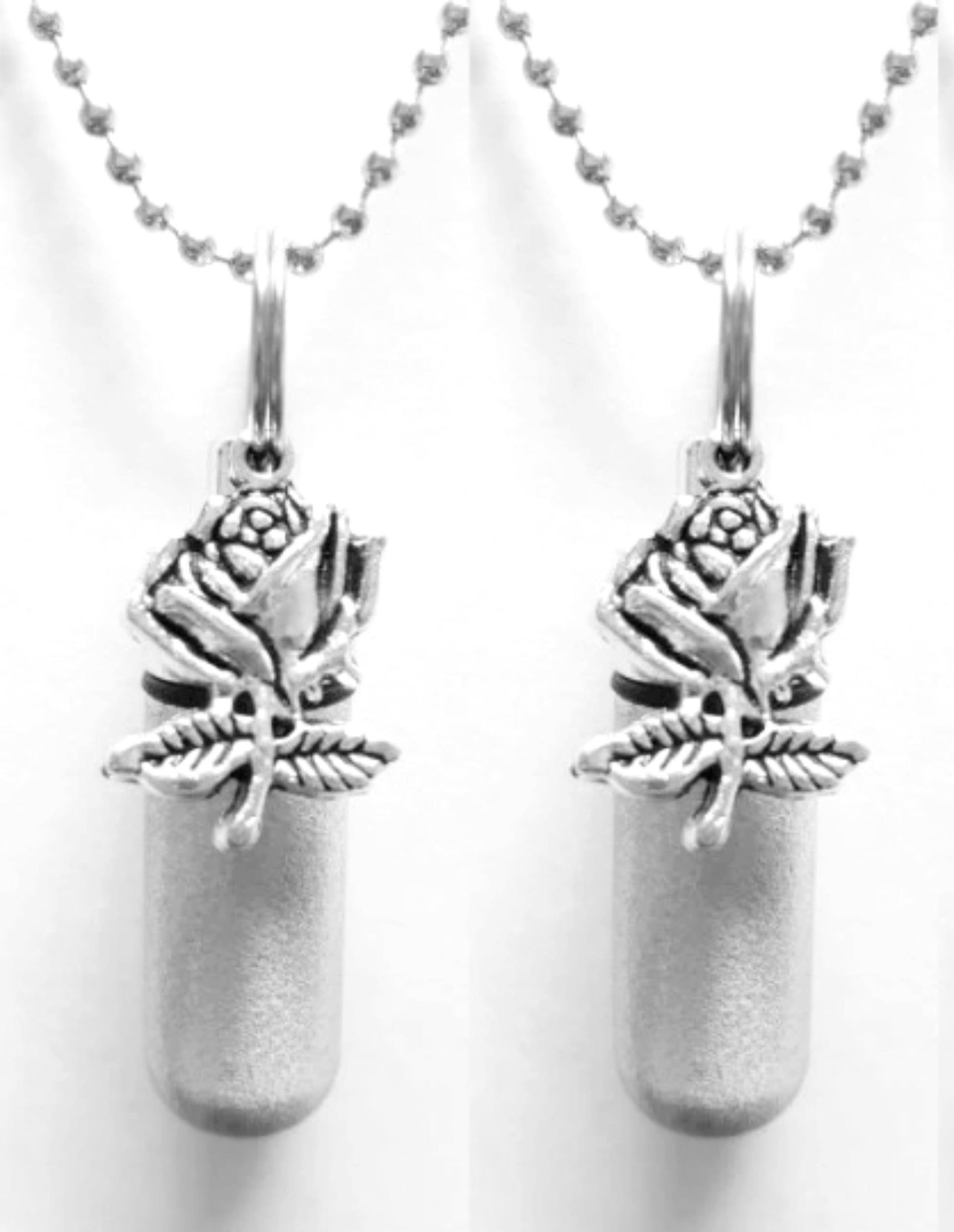 Set of TWO Brushed Silver Anointing Oil Holders with Silver Roses - With Velvet Pouches, Ball-Chain Necklaces