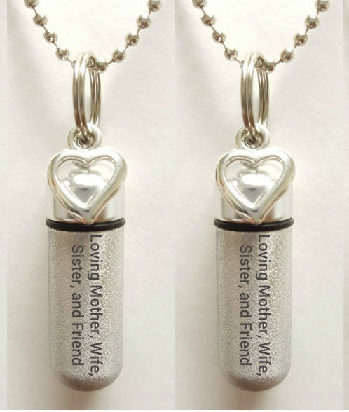 Set of Two ENGRAVED Brushed Silver CREMATION URN Necklaces "Loving Mother Wife Sister and Friend - w/Open Hearts, Velvet Pouches & Fill-Kit