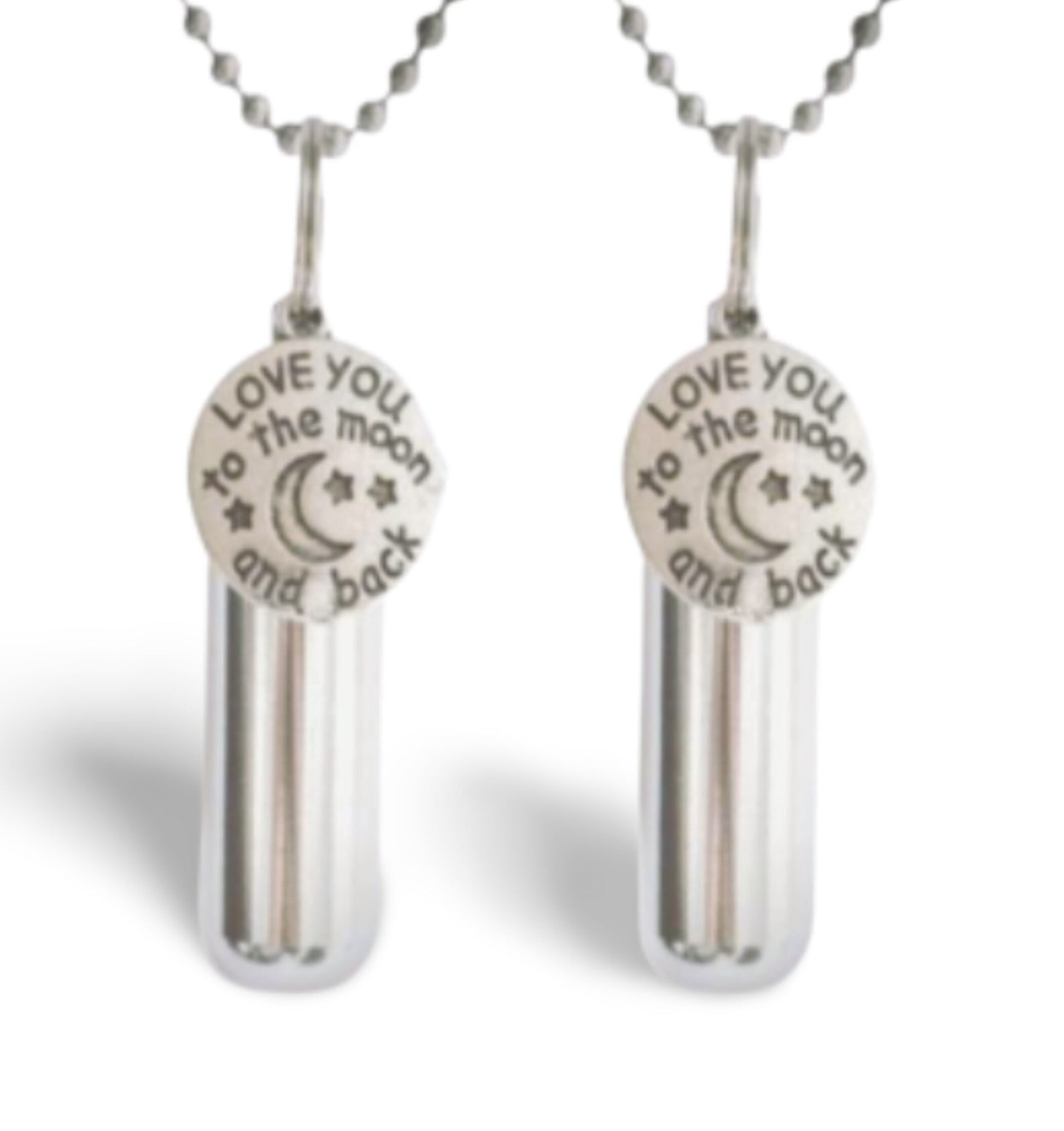 Set of TWO "I Love You To The Moon & Back" Cremation Urns on 24" Ball Chain Necklaces - Memorial Urn, Ashes Necklace, Pet Urn, Child Urn