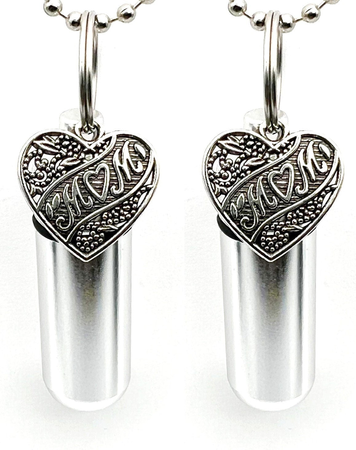 SET OF TWO Silver Mom Love Heart Cremation Urns & containers on TWO 24" Ball Chain Necklaces. Comes complete with TWO Velvet Pouches and Fill Kit.
