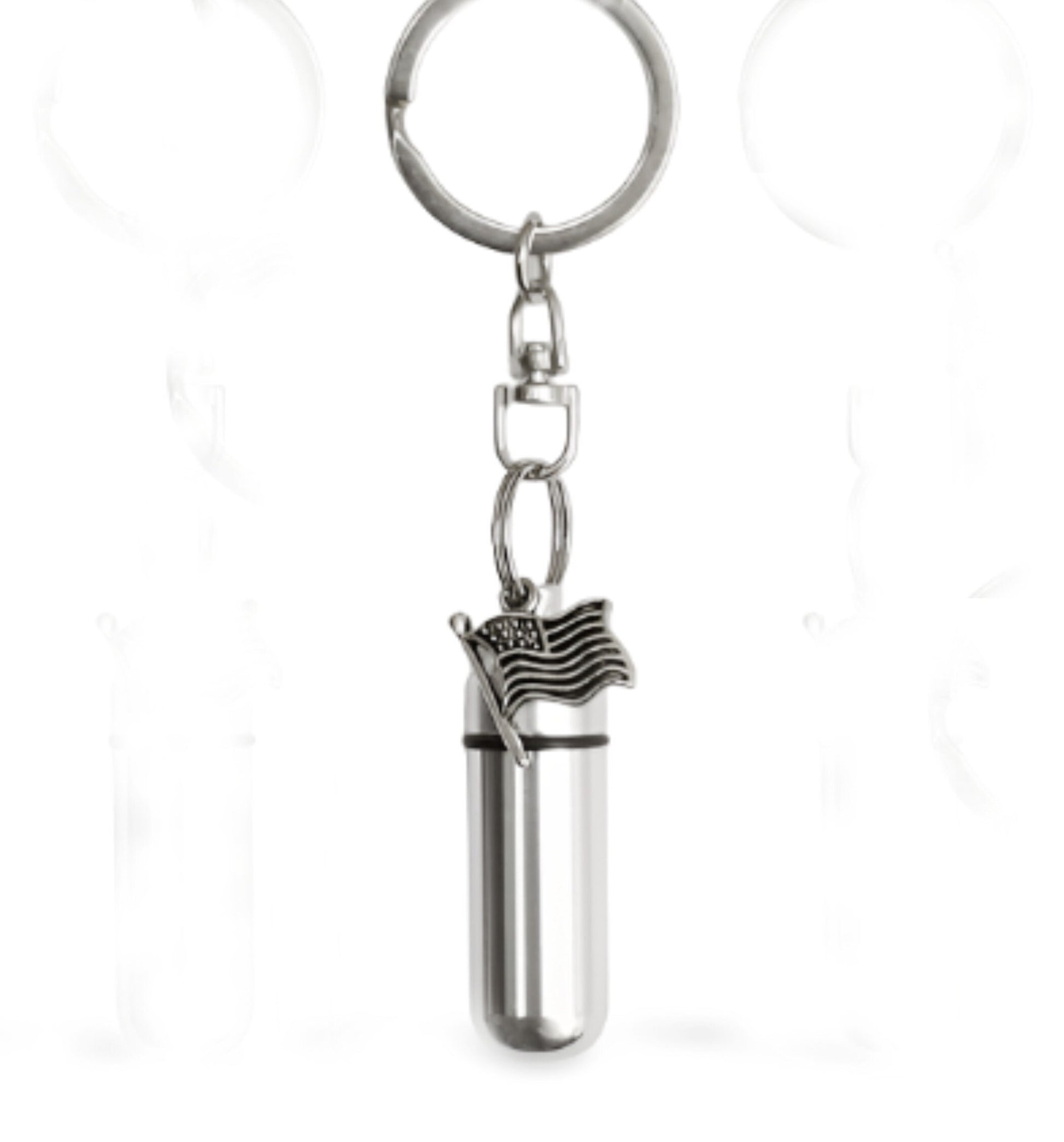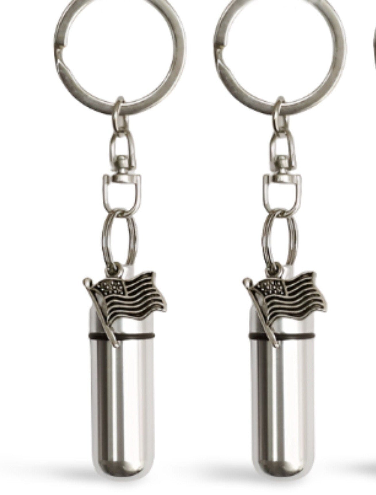 TWO Silver Cremation Urn & container with SILVER AMERICAN FLAG on Stainless Steel Swivel Keyring.