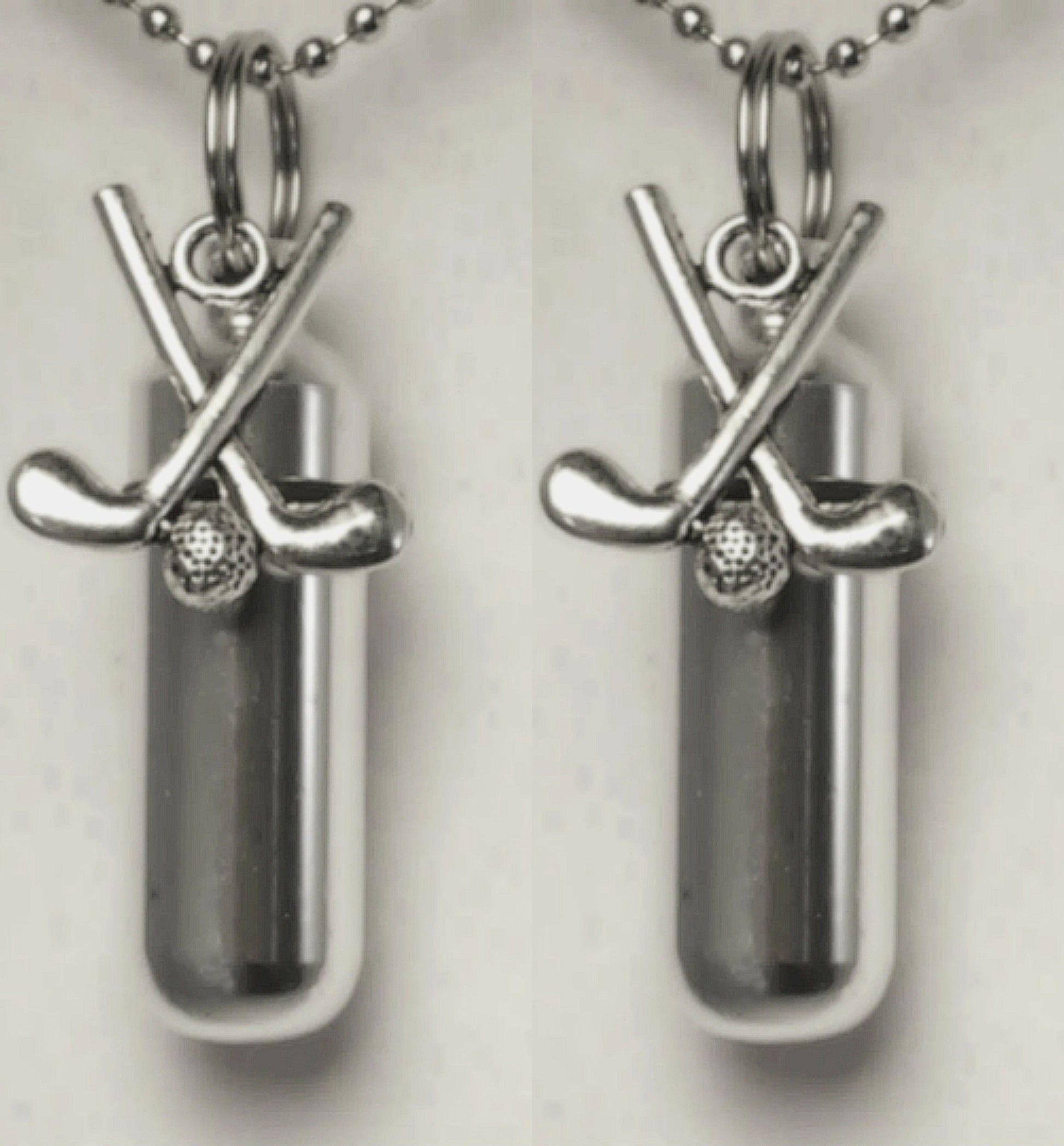 Set of TWO Silver CREMATION URN Necklace Keepsakes with Golf Clubs - Ashes Necklace, Mourning Jewelry, Mourning Keepsake, Personalized Urn