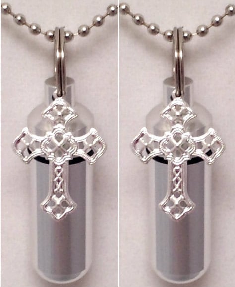 Sturdy, discreet, and secure, this Urn is 1-3/4 inches tall and has a small clear container inside to hold a small amount of anointing oil. It is made of aircraft grade anodized aluminum, and will virtually last forever. The urn unscrews to reveal the storage chamber. Inside there is a clear container. A rubber gasket on the screw-on cap provides a waterproof seal. This container is strong and lightweight enough to carry every day and fits nicely on a keyring or a necklace.