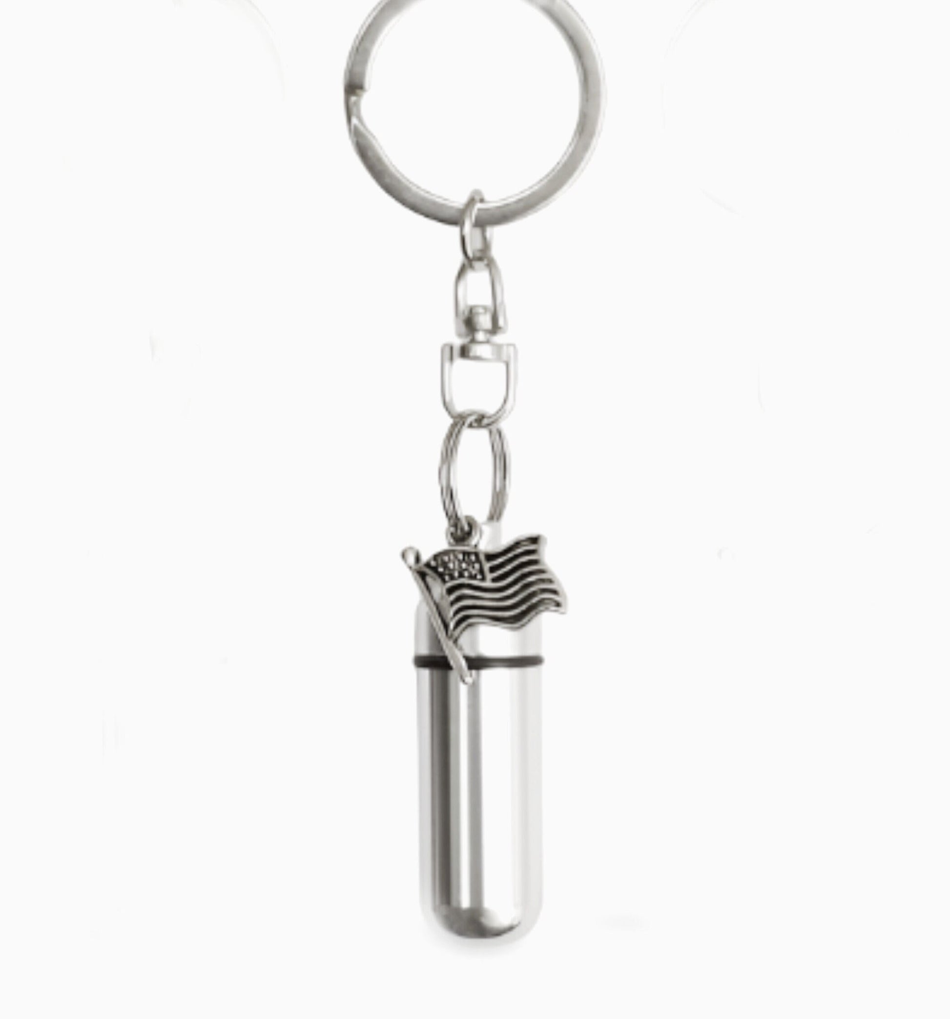 Silver Cremation Urn & container with SILVER AMERICAN FLAG on Stainless Steel Swivel Keyring.