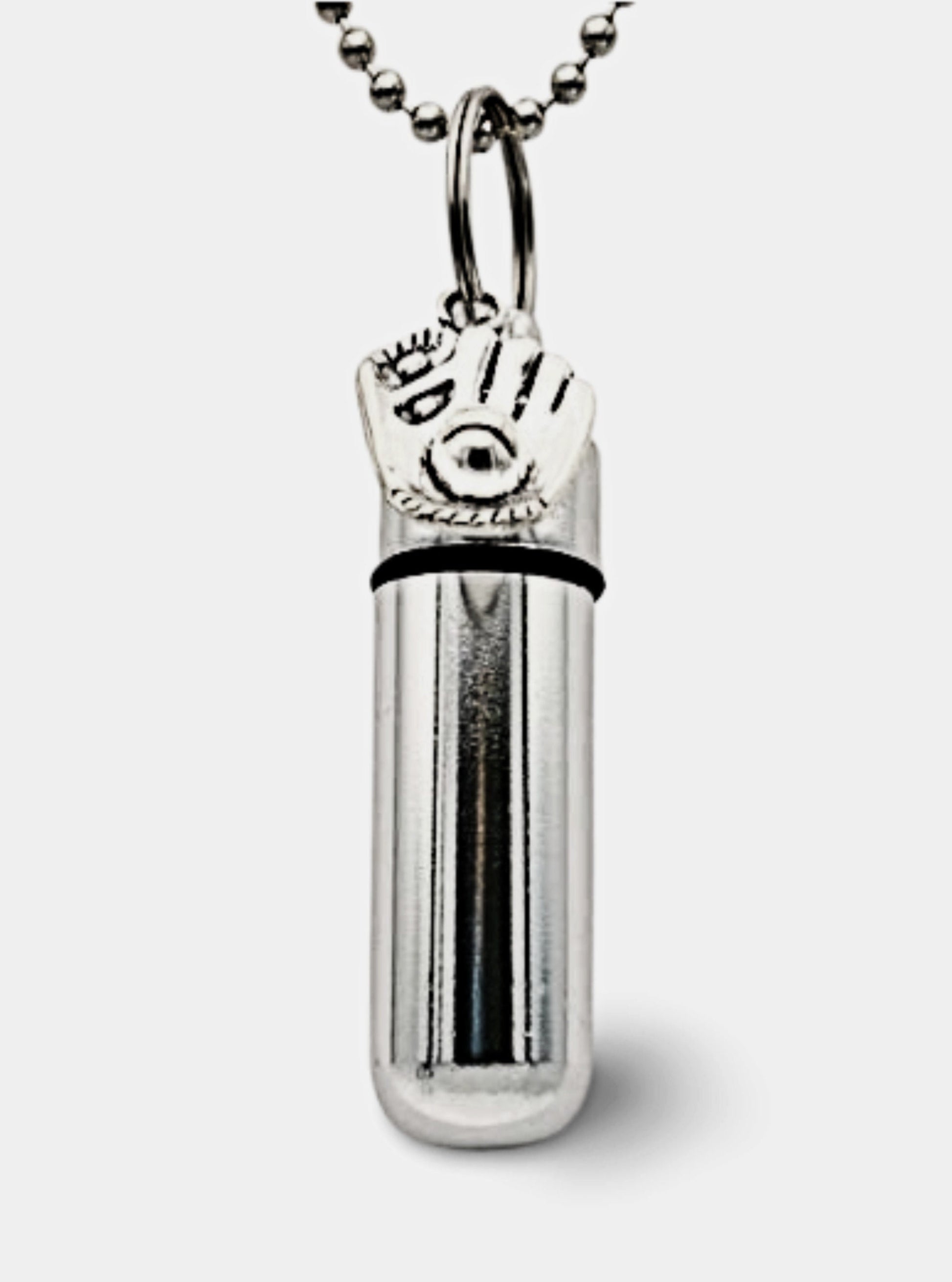 A wonderful & personal CREMATION URN Memento & remembrance of a special loved one who was also a BASEBALL fan. Wear it everyday on the included 24" ball-chain, or hang it from a picture frame, a car mirror, or a keychain. Each Keepsake Urn includes an individual Black Velvet Pouch, and 24" Steel Ball-Chain Necklace