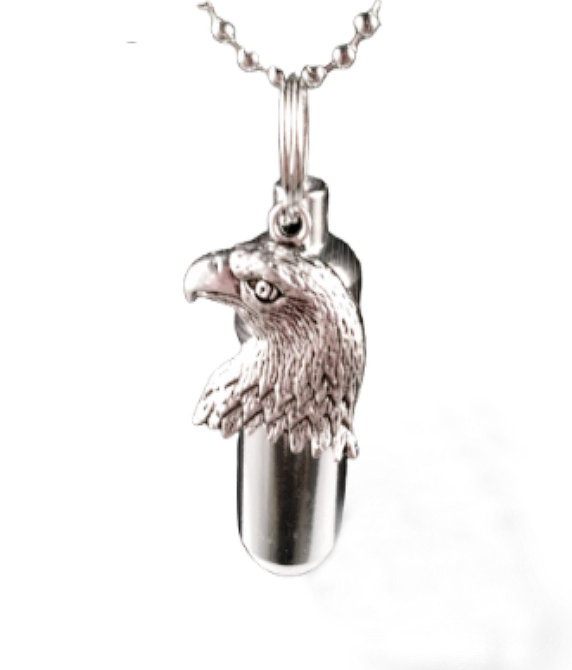 Silver Cremation Urn & container on 24" Steel Ball Chain Necklace with Silver Bald Eagle Charm