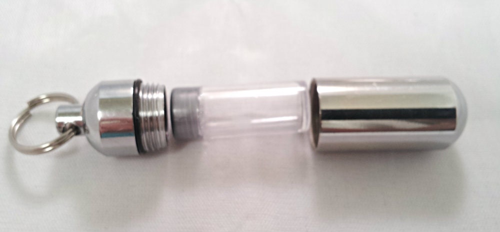 Sturdy, discreet, and secure, this Urn is 1-3/4 inches tall and has a small clear container inside to hold a small amount of your loved ones ashes. Keep them close to you always. Urn is made of aircraft-grade anodized aluminum and will last forever. The urn unscrews to reveal the storage chamber. Inside there is a clear container to keep the ashes safe and dry. A rubber gasket on the screw-on cap provides a waterproof seal. These urns are strong and lightweight enough to carry every day and fits nicely on a keyring or a necklace.