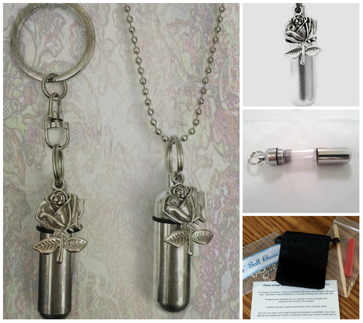 Silver ROSE 2pc. Special Set - Cremation Urn Necklace & Keychain Urn and Velvet Pouches