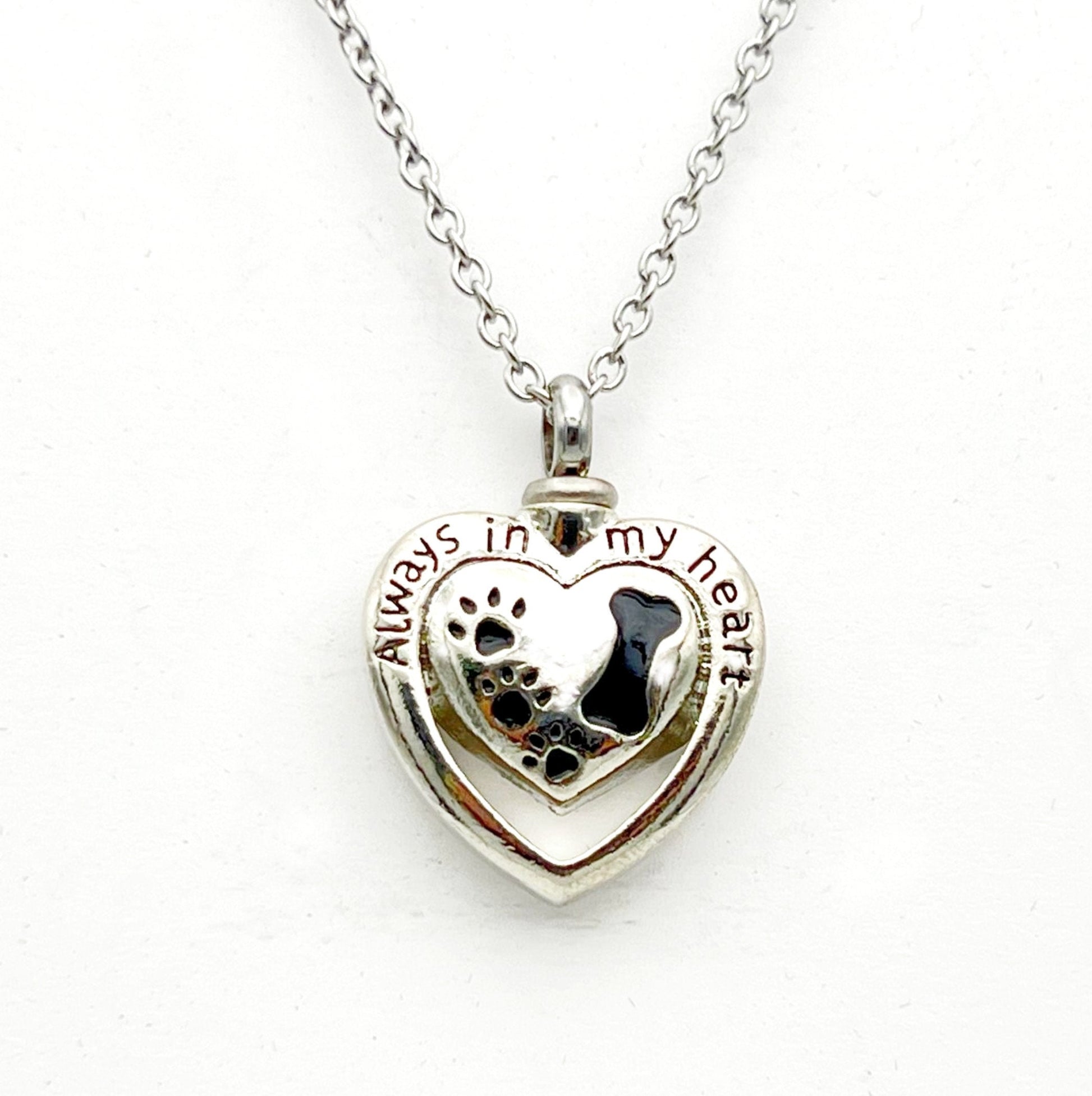 Steel "Always In My Heart" with Paw & Bone - Pet Cremation Urn on 20" Curb Chain Necklace - with Velvet Pouch and Fill Kit, Pet loss