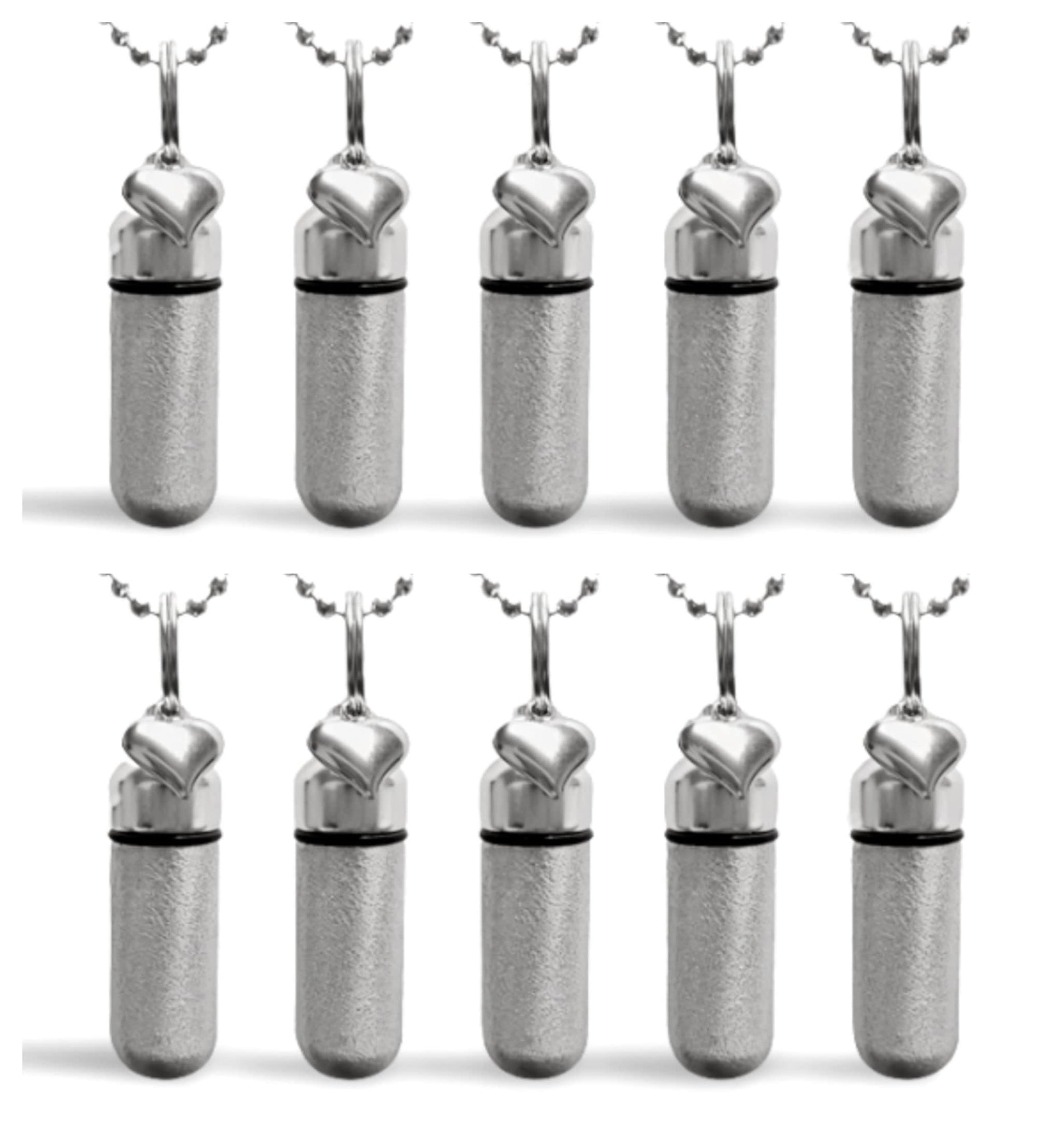 TEN LOVELY LASER ENGRAVED CREMATION URN NECKLACE KEEPSAKES, TEN VELVET POUCHES, FILL KIT, AND TEN 24" STAINLESS STEEL BALL CHAINS. CUSTOM LASER ENGRAVING IS INCLUDED ON THIS ITEM (on all 10 urns) - - You can add anything you like up to 51 characters total - 17 characters per line (letters, numbers, & spaces) on up to 3 lines. Please contact me with any questions.