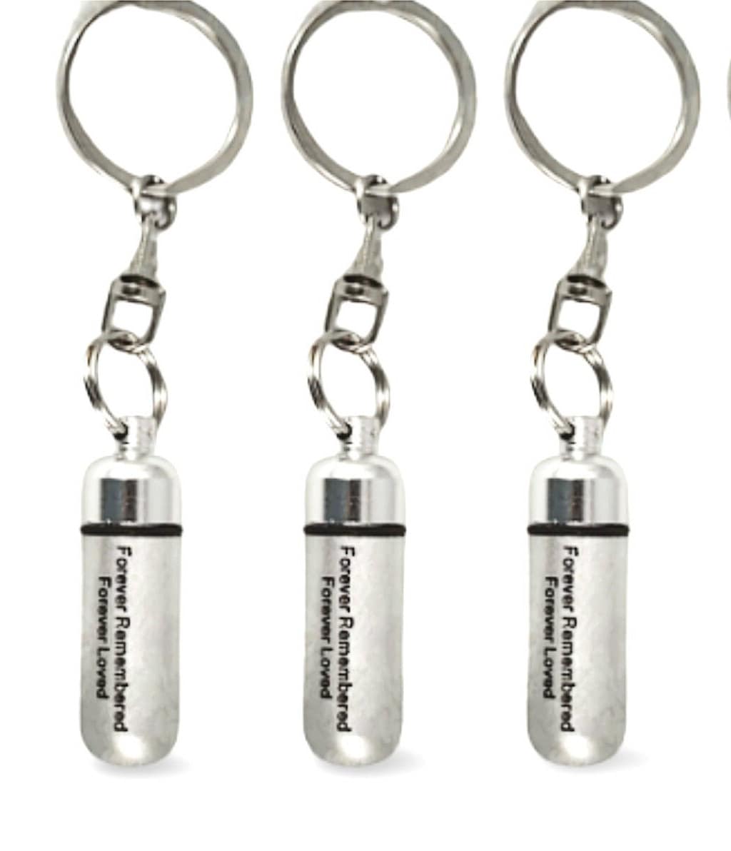 THREE Engraved "Forever Remembered Forever Loved" Brushed Silver CREMATION URNS On Steel Keychains, Memorial Jewelry, Urn Jewelry, Pet Urn