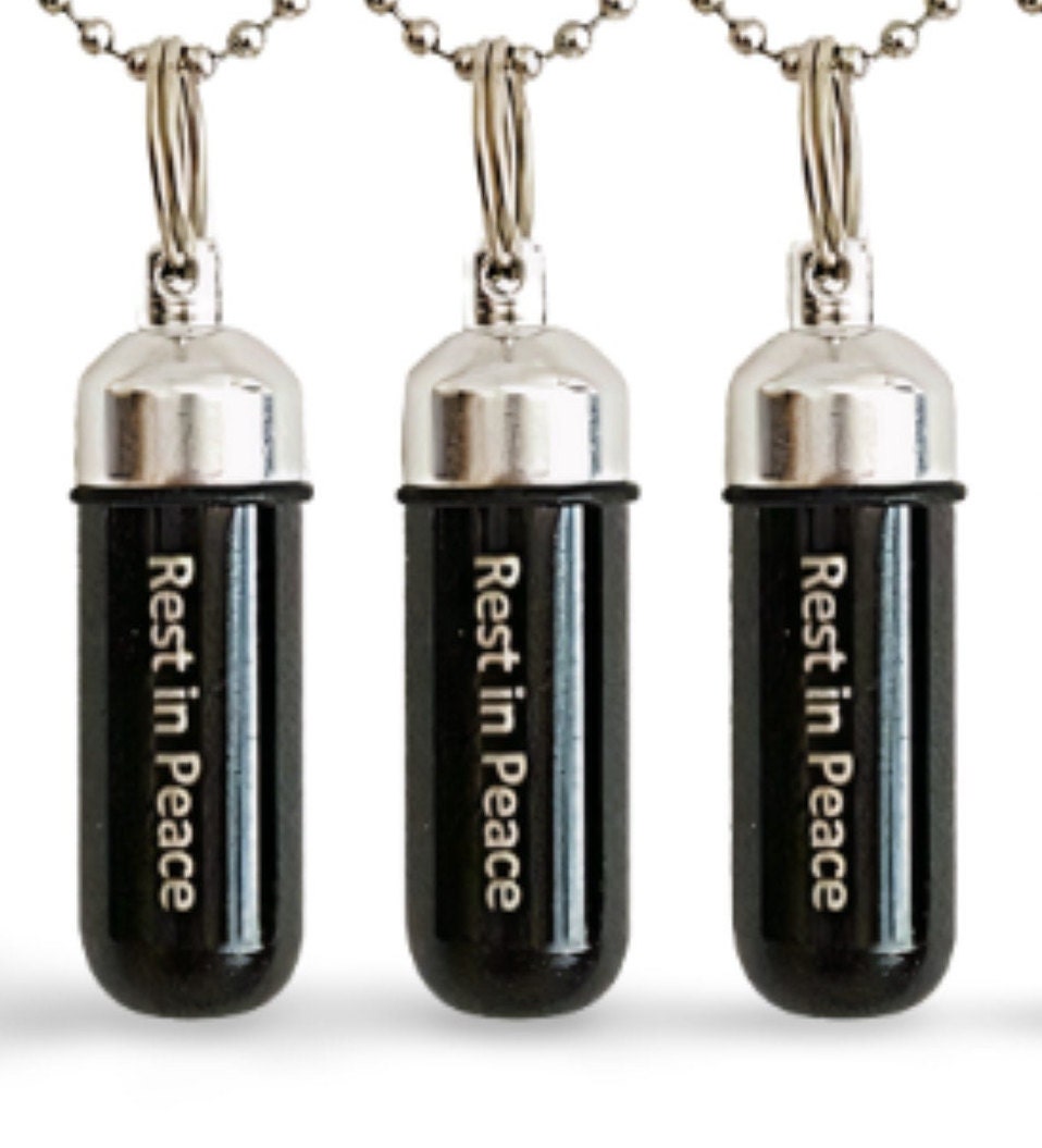 THREE Engraved "Rest In Peace" Black Cremation Urn Necklaces with Velvet Pouches, Ball Chains and Fill Kit - Memorial Jewelry, Urn for Ashes
