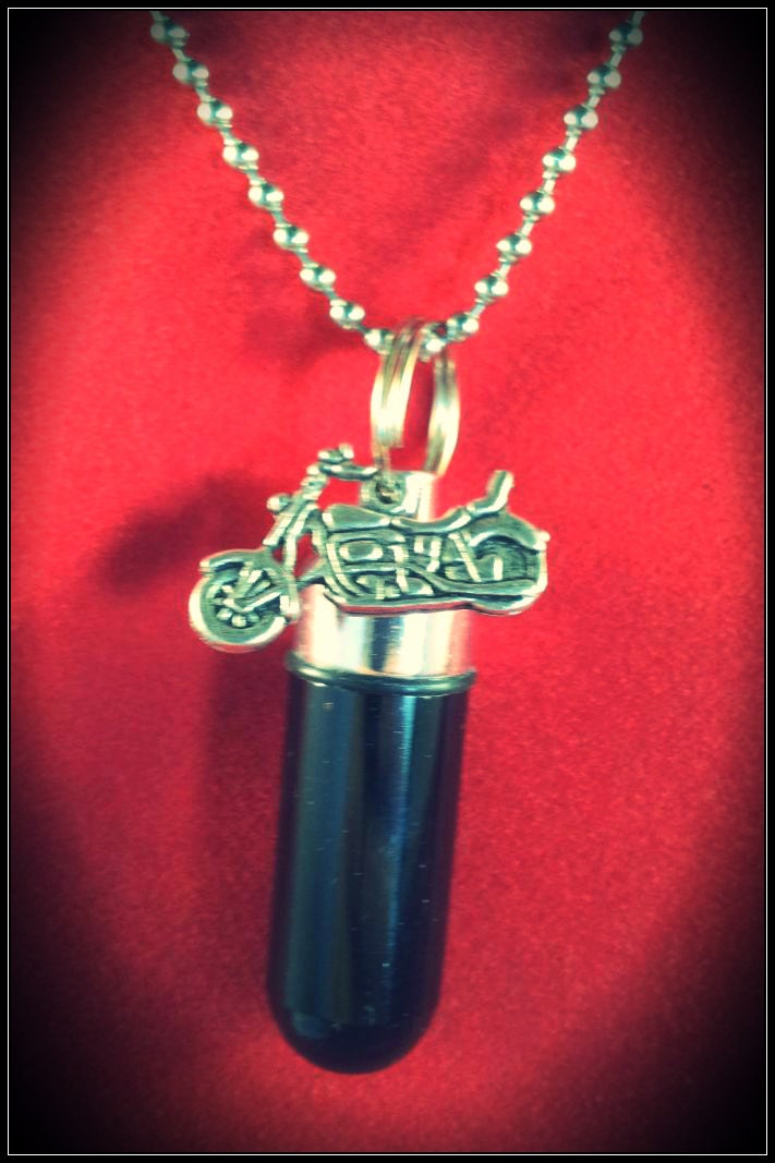 Black/Silver Motorcycle Urn & container on 24" Ball-Chain Necklace - Custom Hand Assembled.... with Velvet Pouch and Fill Kit