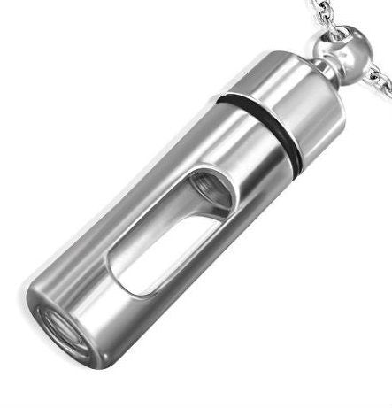 Sturdy, discreet, and secure, holds a small amount of your loved one's ashes. Keep them close to you always. Urn is made of 316L Stainless Steel and will last forever. These urns are strong and lightweight enough to carry every day and fits nicely on a keyring or a necklace.
