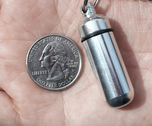 KEYCHAIN / PENDANT / LOCKET Sturdy, discreet, and secure, this Urn is 1-3/4 inches tall and has a small clear container inside to hold a small amount of your loved ones ashes. Keep them close to you always. Urn is made of aircraft-grade anodized aluminum and will last forever. The urn unscrews to reveal the storage chamber. Inside there is a clear container to keep the ashes safe and dry. A rubber gasket on the screw-on cap provides a waterproof seal. These urns are strong and lightweight enough to carry every day and fits nicely on a keyring or a necklace.