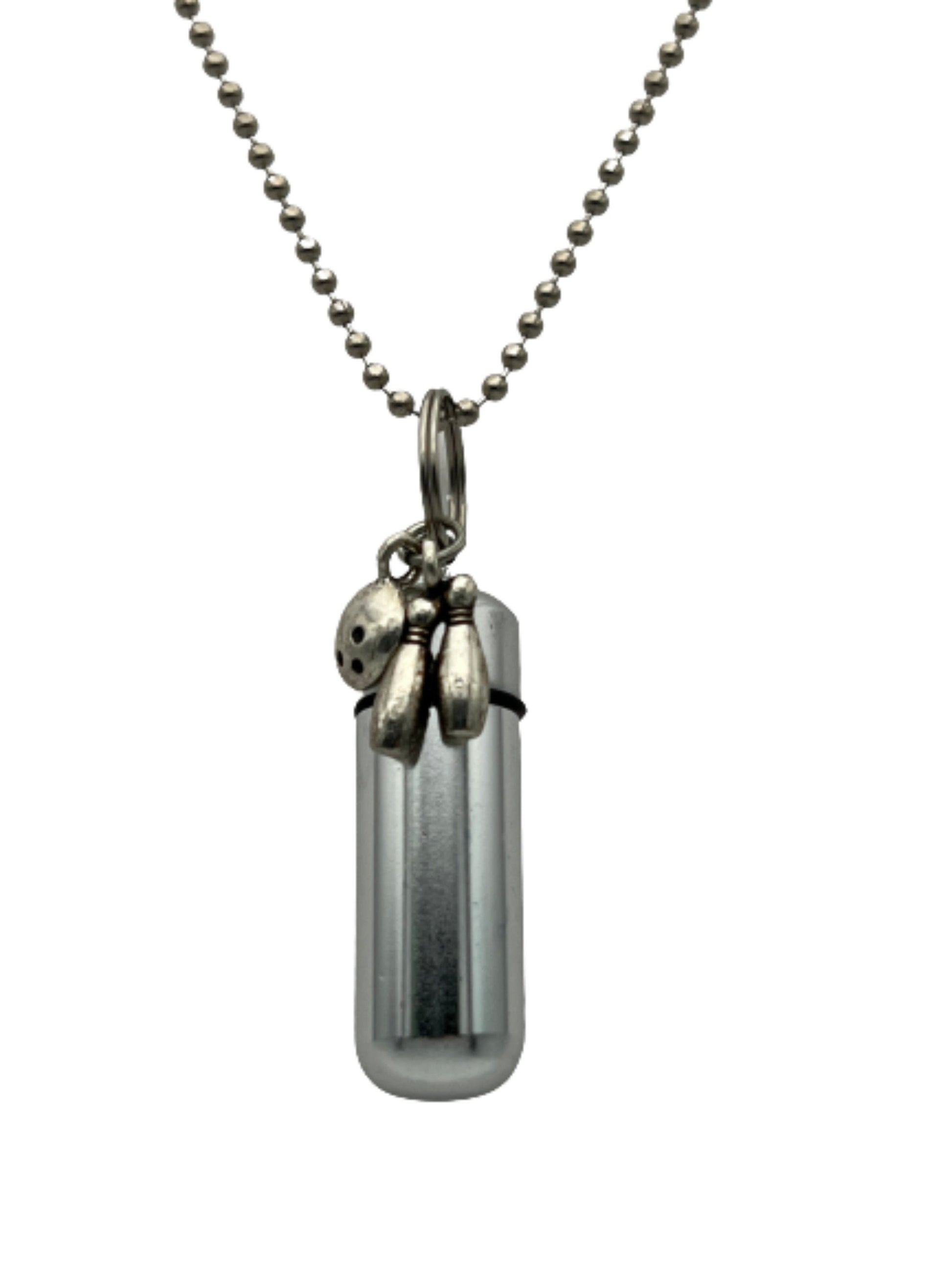 Wonderful Silver Bowling Ball and Pins CREMATION URN Necklace Keepsake - Includes 24' Steel Ball Chain Necklace, Velvet Pouch & Fill Kit